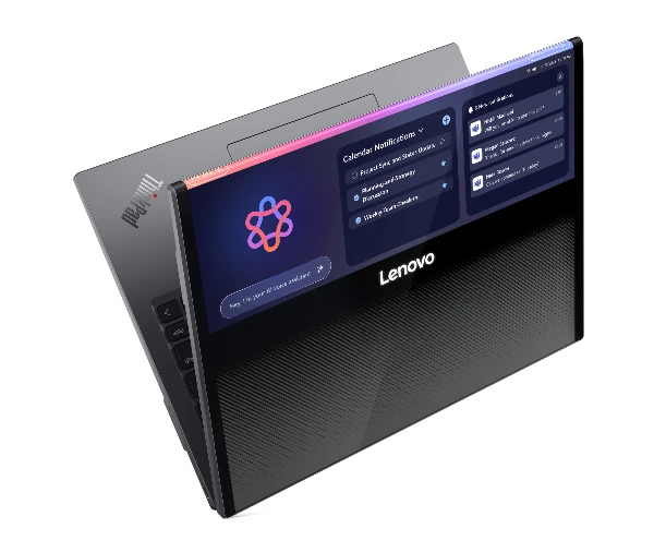 Największe wow pojawia się jednak z tyłu. Lenovo wspólnie z Corningiem stworzyło przezroczysty panel Gorilla Glass Victus 2, pod którym widać fragment zwiniętego ekranu OLED. Gdy laptop jest zamknięty ten tylny panel działa jak drugi wyświetlacz - pokazuje powiadomienia, kalendarz, statusy aplikacji, a nawet interfejs firmowego chatbota AI.