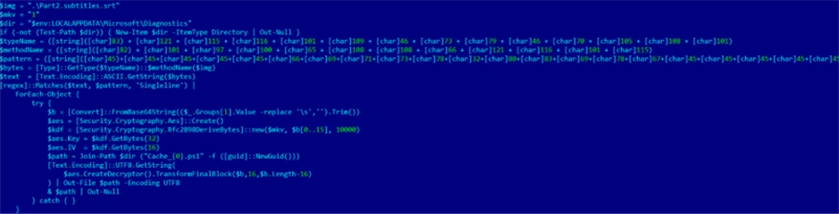 - Dekodowanie ukrytych plików: Photo.jpg nie jest zdjęciem, lecz kontenerem danych. Skrypt odczytuje go bajt po bajcie, odejmuje od każdego bajtu wartość 3 i zapisuje wynik w folderze o nazwie Microsoft.WindowsSoundDiagnostics. Nazwa dobrana tak, by nikt nie zwrócił uwagi.