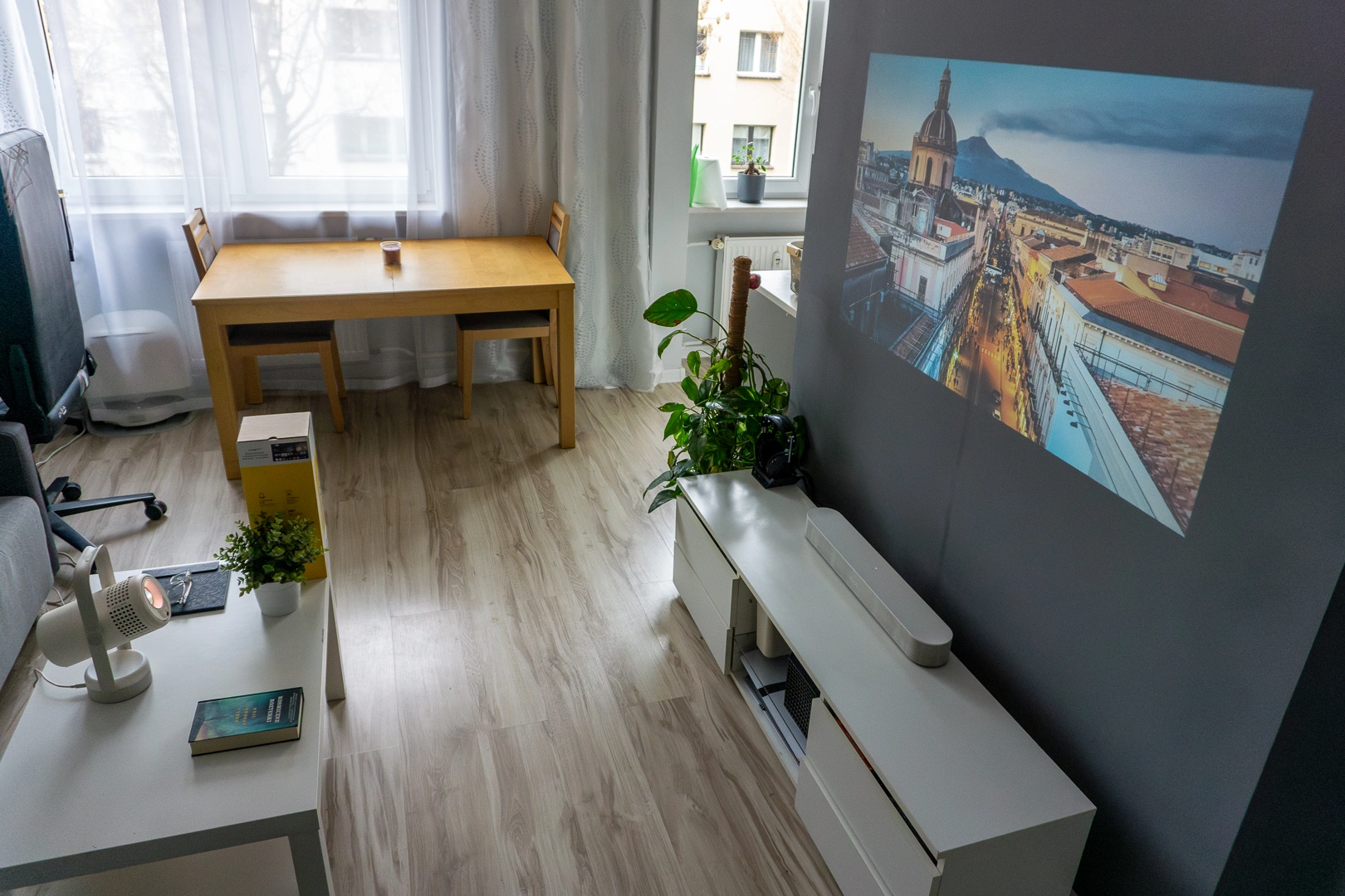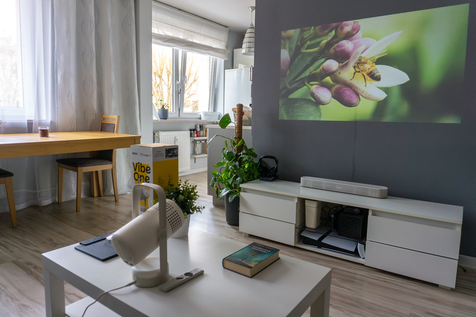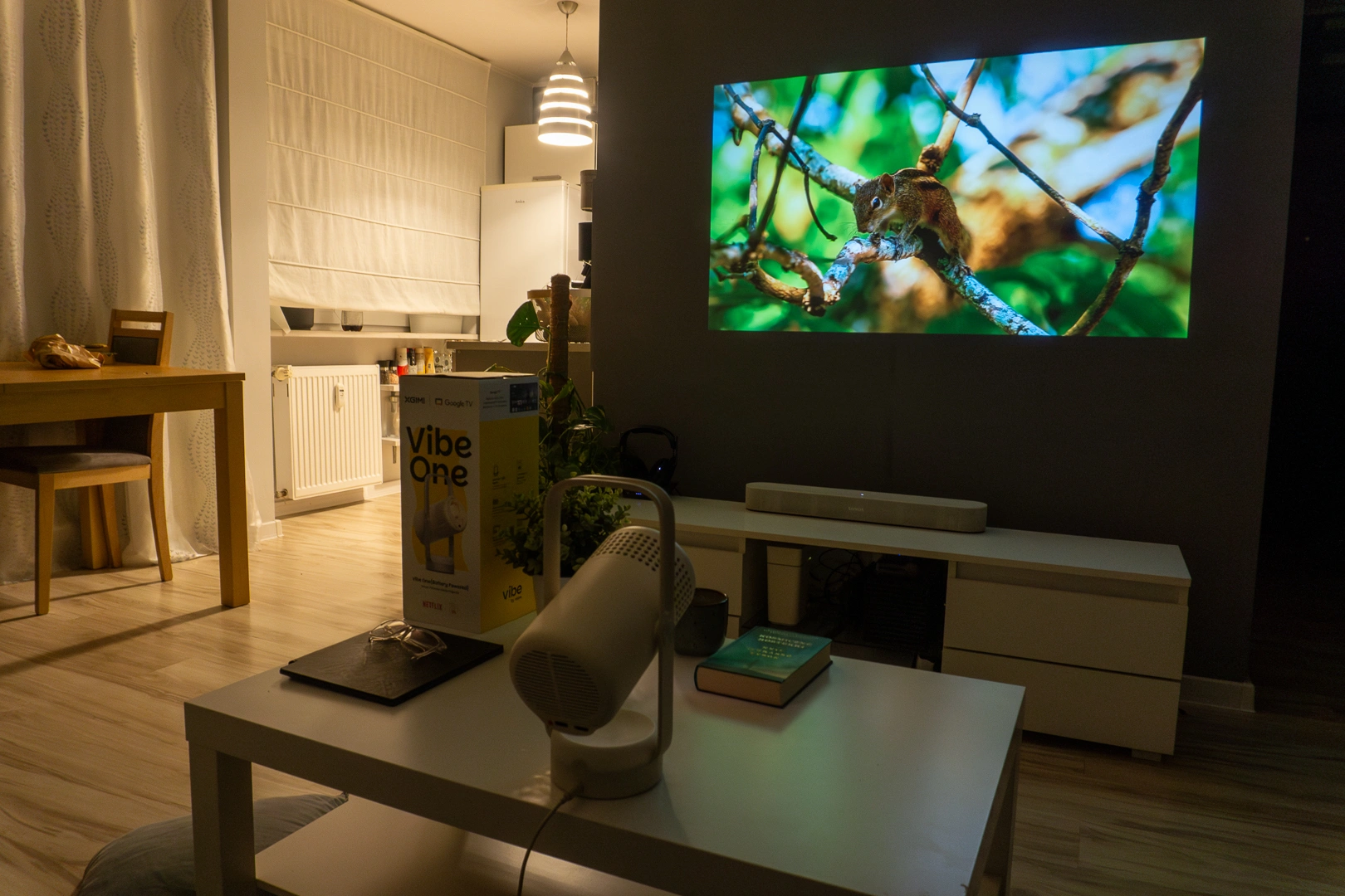 Z jasnością na poziomie 250 ISO lumenów, projektor rzuca obraz widoczny za dnia, również w dobrze nasłonecznionym pomieszczeniu. Widać to na przykładzie mojego salonu, gdzie Vibe One działa w standardowym trybie, bez zasłaniania okien roletami. Oczywiście kolory nie są wtedy tak nasycone jak podczas nocnych seansów, a kontrast niezbyt wysoki, ale uzyskany obraz jak najbardziej wystarczy do oglądania serialu podczas obiadu.