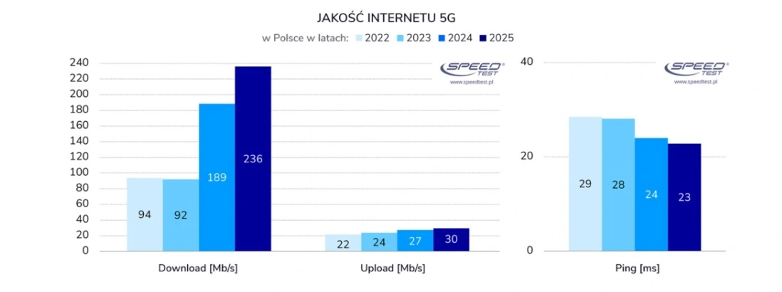 - średnia prędkość pobierania na 5G: 236 Mb/s w 2025, 189 Mb/s w 2024;