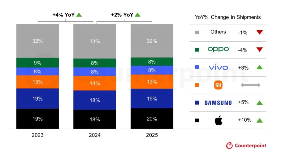 Podium zamyka Xiaomi z wynikiem 13 proc. Na czwartym miejscu mamy vivo, Oppo, a pozostałe 32 proc. udziału na rynku telefonów posiadają inne marki. Poza pierwszą piątką duże wzrosty zaliczyły dwie marki: Nothing oraz Google, które w 2025 r. zwiększyły dostawy smartfonów o odpowiednio 31 i 25 proc.
