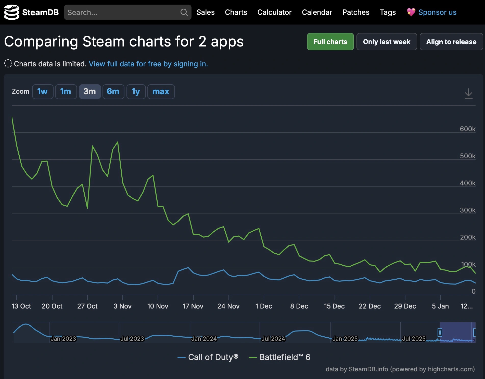 Ktoś może napisać: - Ej Szymon, ale to tylko kilka tygodni obsuwy. Weź dotknij trawy - tyle tylko, że mówimy o absolutnie kluczowych kilku tygodniach. Właśnie teraz liczba aktywnych graczy BF6 na Steam spada grubo poniżej 70 tysięcy, podczas gdy rekord jednoczesnych logowań wynosi… 700 tysięcy. Dziesięć razy więcej. Jasne, każda gra wytraca użytkowników po premierze, ale tempo dla BF6 jest alarmujące. Battlefield 6 dał się przegonić takim grom jak Marvel Rivals, Baldur’s Gate 3, Path of Exile 2 czy Rust.