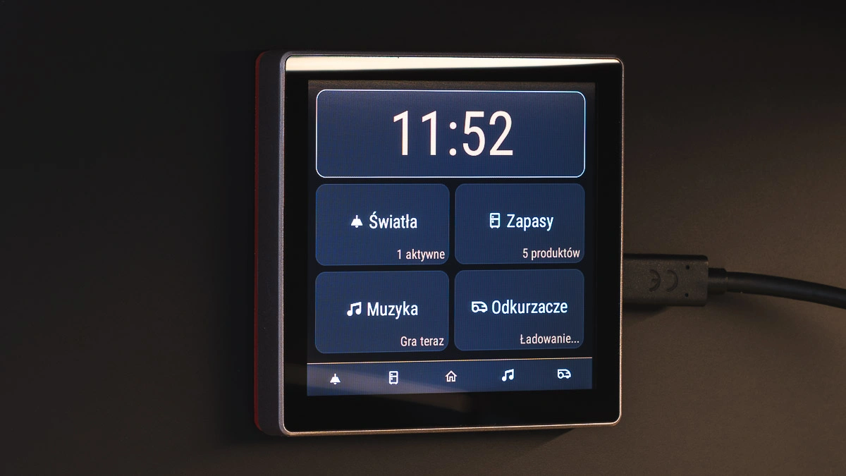 - ekran główny ze skrótami to czterech najważniejszych ekranów, paskiem nawigacyjnym i godziną. Ekran podświetla się automatycznie w momencie, kiedy wchodzi się do kuchni (bo tam trafił ekran);