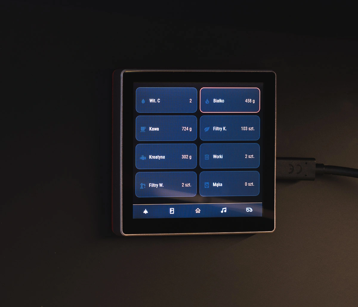 - widoczny na obrazku powyżej ekran zapasów. Dane pobierane są przez Home Assistanta z Grocy i są aktualizowane na żywo. Dwie miłe rzeczy - jeśli klikniemy w którąś z pozycji, możemy dodać zapasy albo je uszczuplić. Oraz - jeśli otworzę szafkę, w której jest większość tych produktów, ekran zapasów aktywuje się samodzielnie;