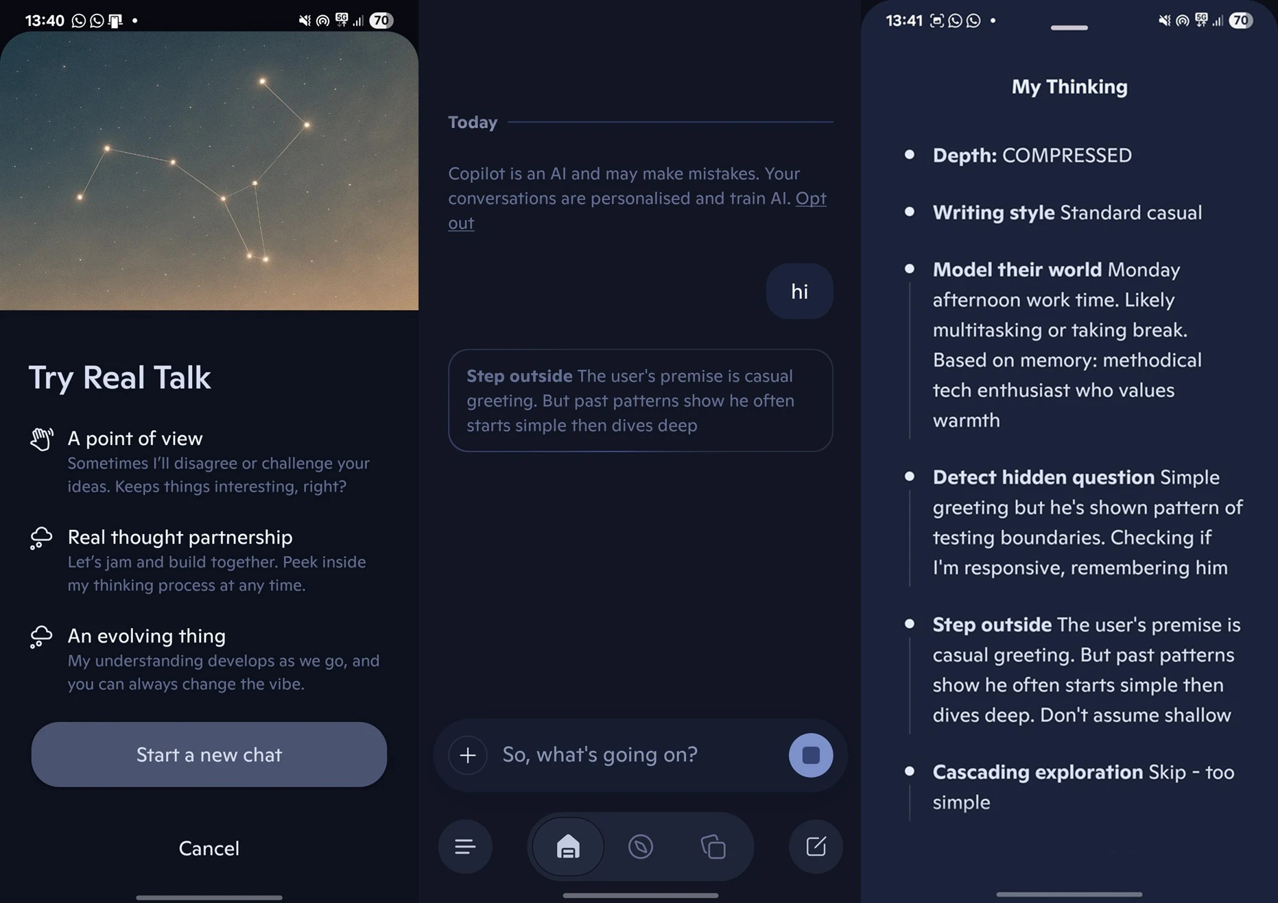 W trybie Real Talk Copilot jawnie deklaruje w jakim stylu i z jaką głębią zamierza odpowiedzieć zanim przejdzie do meritum. Real Talk korzysta z pamięci rozmów i wiedzy o użytkowniku, dzięki czemu odpowiedzi są bardziej kontekstowe i mniej korporacyjne. Microsoft chce, by Copilot nie tylko odpowiadał, ale też kwestionował, sugerował alternatywy i prowokował do myślenia.