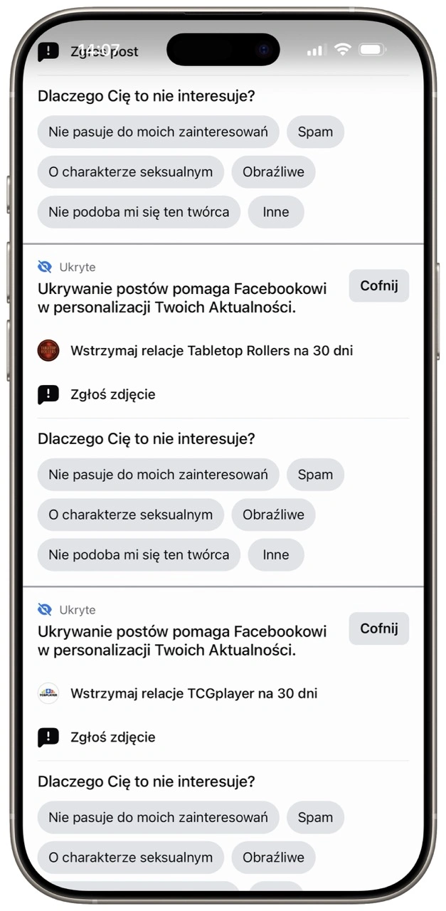 Wygląda na to, że informacji, jakie mu przekazuję, klikając guzik „Ukryj post”! Postanowiłem trochę poeksperymentować, a w praktyce im więcej razy klikam go przy poście profilu, tym jeszcze częściej widuję pochodzące z niego posty. Mam przekonanie graniczące z pewnością, iż wynika to z faktu, że w celu przekazania informacji, że nie chcemy widzieć danego materiału, zatrzymujemy się na nim lub przewijamy feed do góry, bo guzik się schował, a to przecież zaangażowanie.