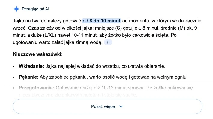 Drugie usprawnienie w przeglądzie AI w wyszukiwarce Google odnosi się do użyteczności rozwiązania. Dotychczas narzędzie wyświetlało wyłącznie odpowiedź. Użytkownik nie mógł z nią wchodzić w interakcję. Do dyspozycji przycisk Pokaż więcej, który wyświetlał dodatkowe szczegóły w danej kwestii.