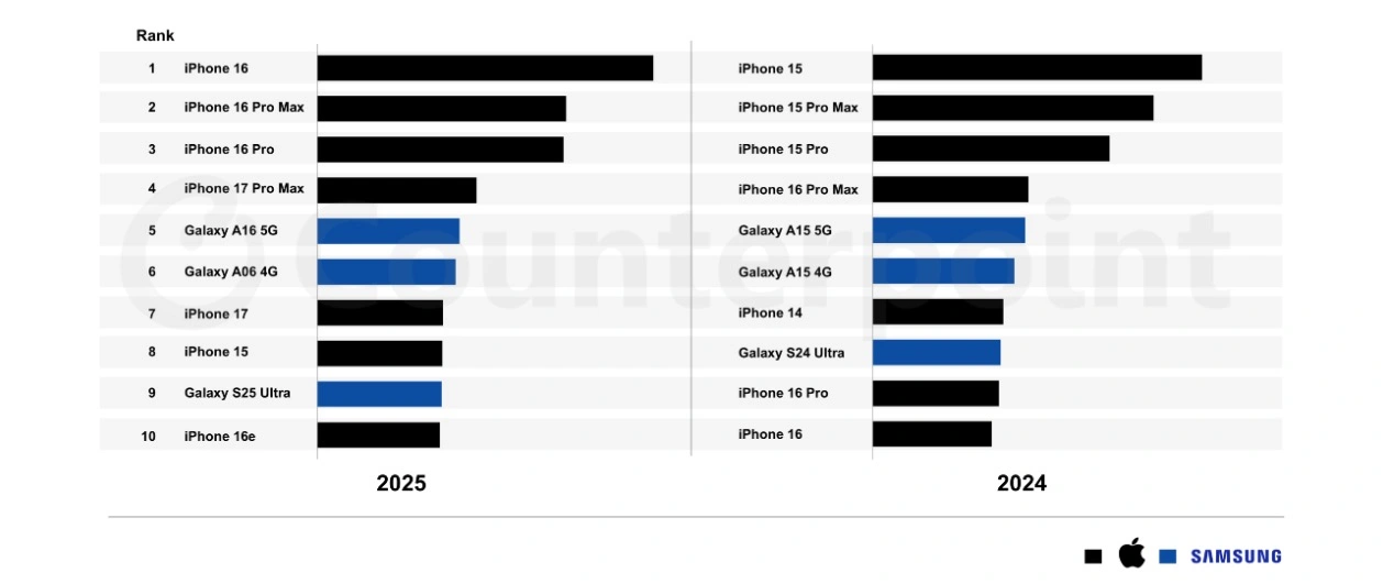 W Polsce dominują przede wszystkim urządzenia z niższej półki cenowej. Potwierdzają to dane operatorów - Orange ujawnił niedawno, że najpopularniejszym (najczęściej sprzedawanym) modelem był Samsung Galaxy A56. Jednak w ujęciu globalnym sprawa wygląda zupełnie inaczej. Tańsze modele Samsunga są popularne, ale nie tak bardzo jak smartfony Apple’a.