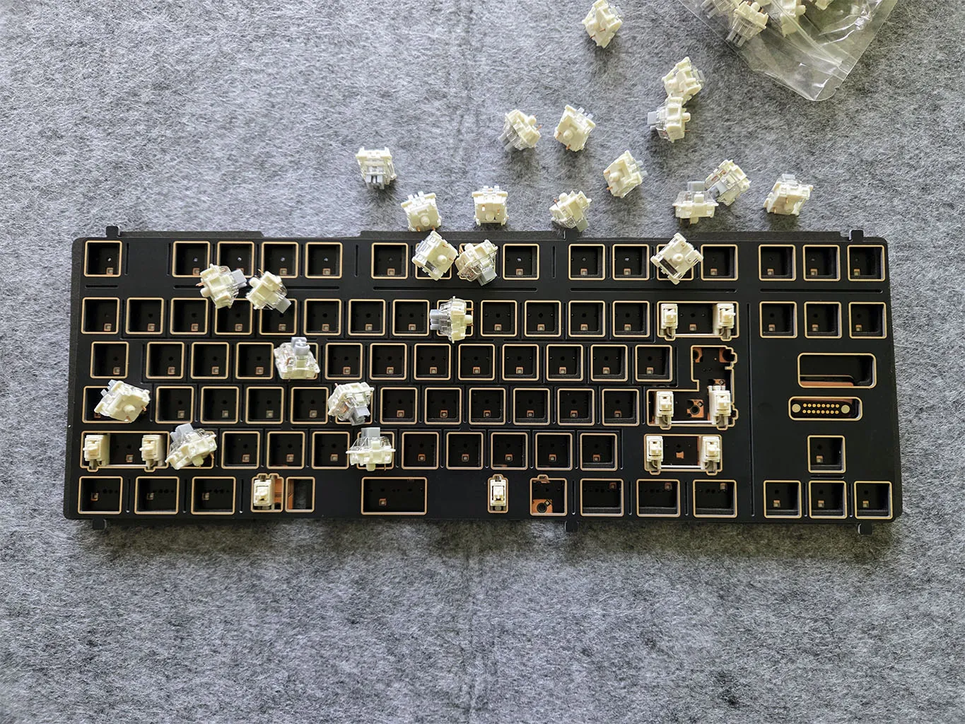 Switche musiałam wbijać pojedynczo, oraz – co ważne w przypadku części klawiszy, upewnić się, że są prawidłowo obrócone (niektóre klawisze mogące występować w różnych wariantach rozmiarowych – przykłądowo Control czy Backspace, zależnie od pożądanego układu wymagają obrotu przełącznika o 90 lub 180 stopni). Ponadto każde jedno gniazdo musiałam trzymać także z tyłu – tak aby nie wypchnąć gniazd z płyty. Proces trochę irytujący, zjadający nie tylko czas i nerwy, ale nadal całkiem prosty.