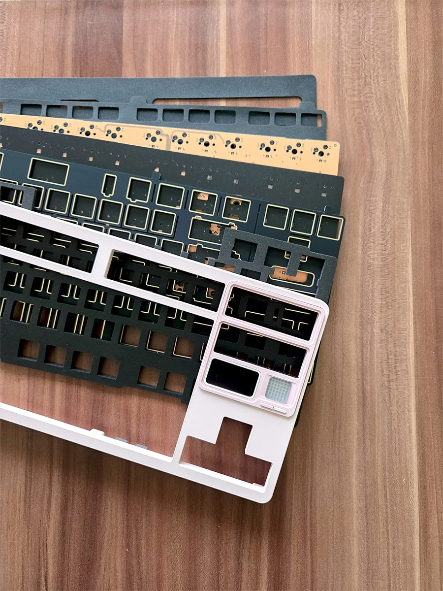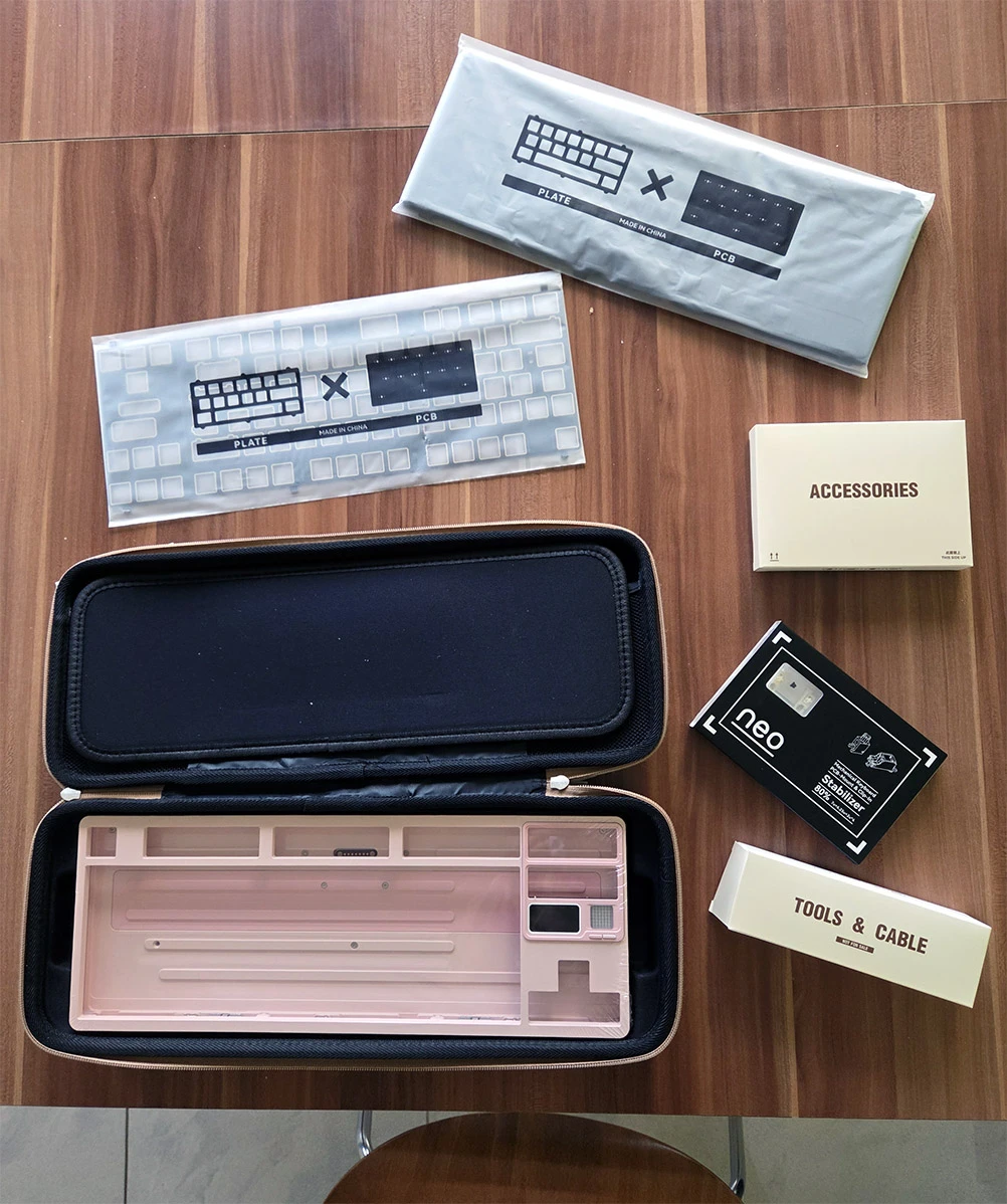 Budowę zaczęłam od rozłożenia QK80 Mk2, który jest szalenie bogaty. W jego skład wchodzi – uwaga, bo będzie dość długo: podstawa ze wbudowaną baterią, pokrywa ze wbudowanym ekranem, płyta drukowana (PCB), warstwa PET, warstwa IXPE, gąbka dla PCB, płyta FR4, dodatkowe taśmy do ekranu, śrubki i ochraniacze. Dodatkowo Qwertykeys do każdego zamówienia QK80 Mk2 dorzuca stabilizatory, ochronne etui do przenoszenia, ściągacz przełączników i klawiszy, kabel USB i śrubokręt.