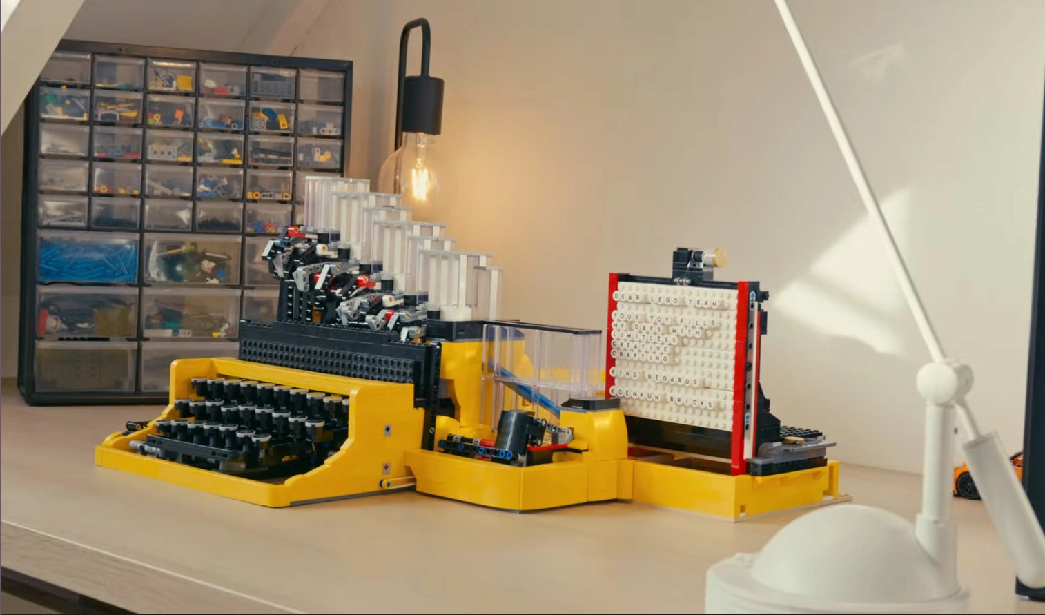 Kluczowe wyzwanie było oczywiste: Lego nie oferuje wypukłych liter nadających się do klasycznego uderzenia w taśmę barwiącą. Twórca musiał więc wymyślić maszynę do pisania od nowa. Zamiast czcionek użył okrągłych płytek 1×1 z nadrukowanymi znakami, które są kolejno uwalniane z magazynków, zsuwają się po rampie, a następnie są dociskane do "kartki" z białych płytek. Każdy klawisz uruchamia przy tym nie jeden, a trzy mechanizmy: zwolnienie litery, przesunięcie karetki oraz dociśnięcie znaku - ostatnie następuje dopiero po puszczeniu klawisza.