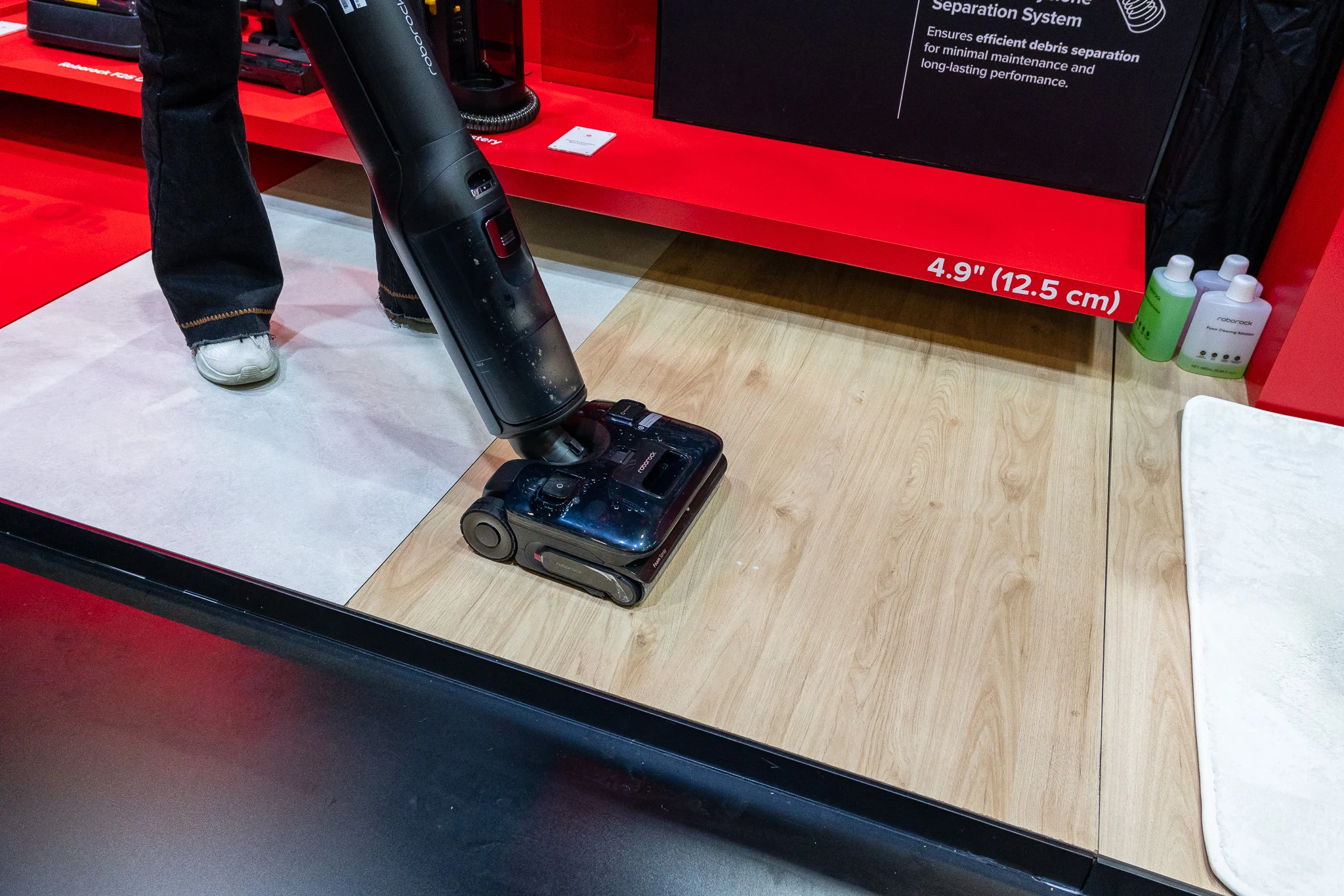To rozwiązanie jest szczególnie skuteczne w walce z mokrymi plamami - rozlana kawa czy keczup znikają w ułamku sekundy, wciągnięte do wnętrza maszyny. Producent zadbał też o bezpieczeństwo dywanów: gdy czujniki wykryją miękkie podłoże, mop unosi się na 15 mm, a specjalna fizyczna osłona tworzy barierę, która gwarantuje, że wilgotny wałek nie dotknie runa.
