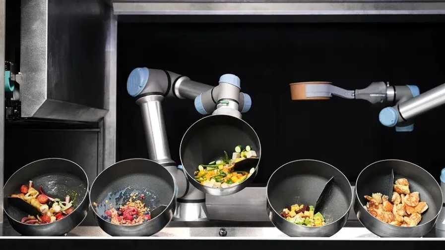 Robot nie tylko dozuje składniki, ale realnie gotuje, dostosowując proces obróbki cieplnej do konkretnego dania. To nie tylko duży Air Fryer, ale także robot z ramionami wymachującymi garnkami.