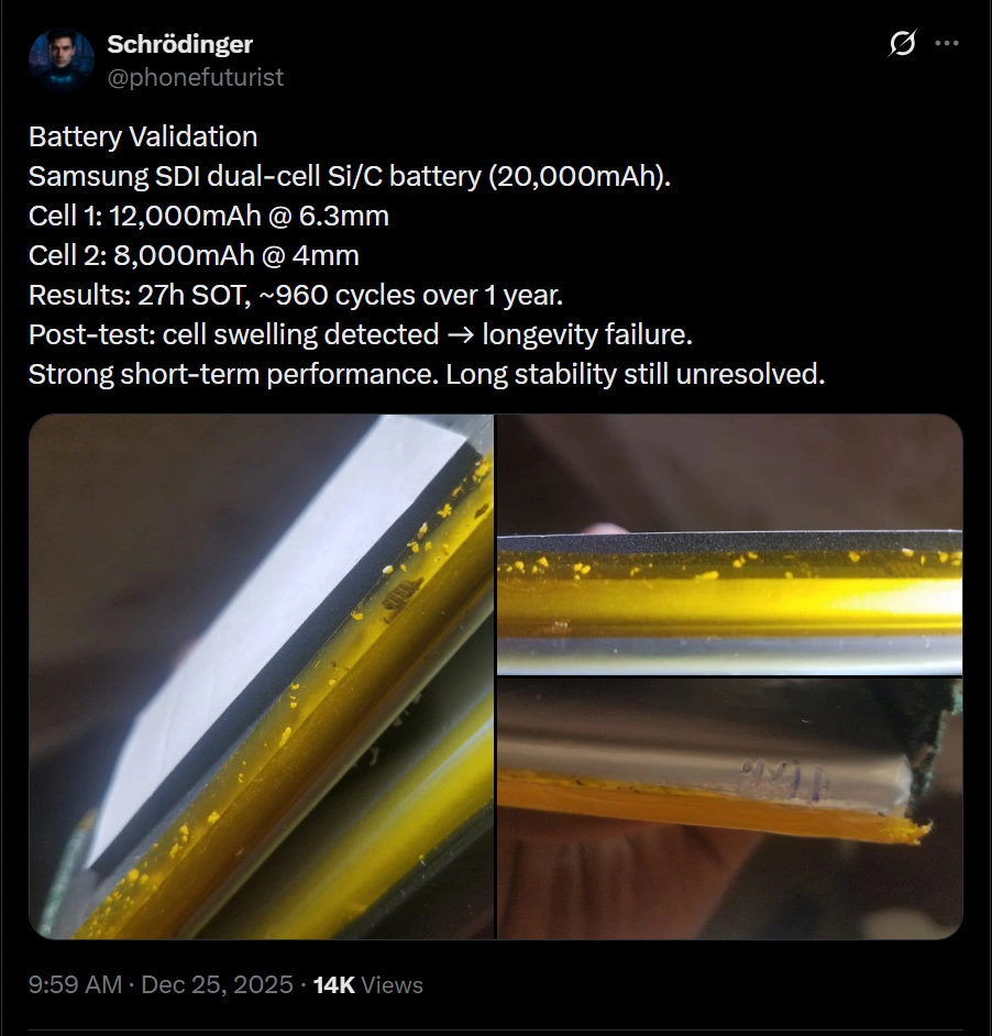 Entuzjazm studzi jednak "palący problem" opisany w dokumentacji testowej baterii. Po około roku intensywnego użytkowania i blisko 960 pełnych cyklach ładowania, w prototypowej baterii zaobserwowano puchnięcie ogniw - szczególnie mniejszego, 8-tysięcznego akumulatora. Według nieoficjalnych informacji jego grubość miała wzrosnąć niemal dwukrotnie, co w przypadku smartfona oznaczałoby ryzyka uszkodzenia pozostałych komponentów telefonów. Taki wynik praktycznie przekreśla szanse na szybkie wdrożenie tej technologii do konsumenckich telefonów Galaxy.
