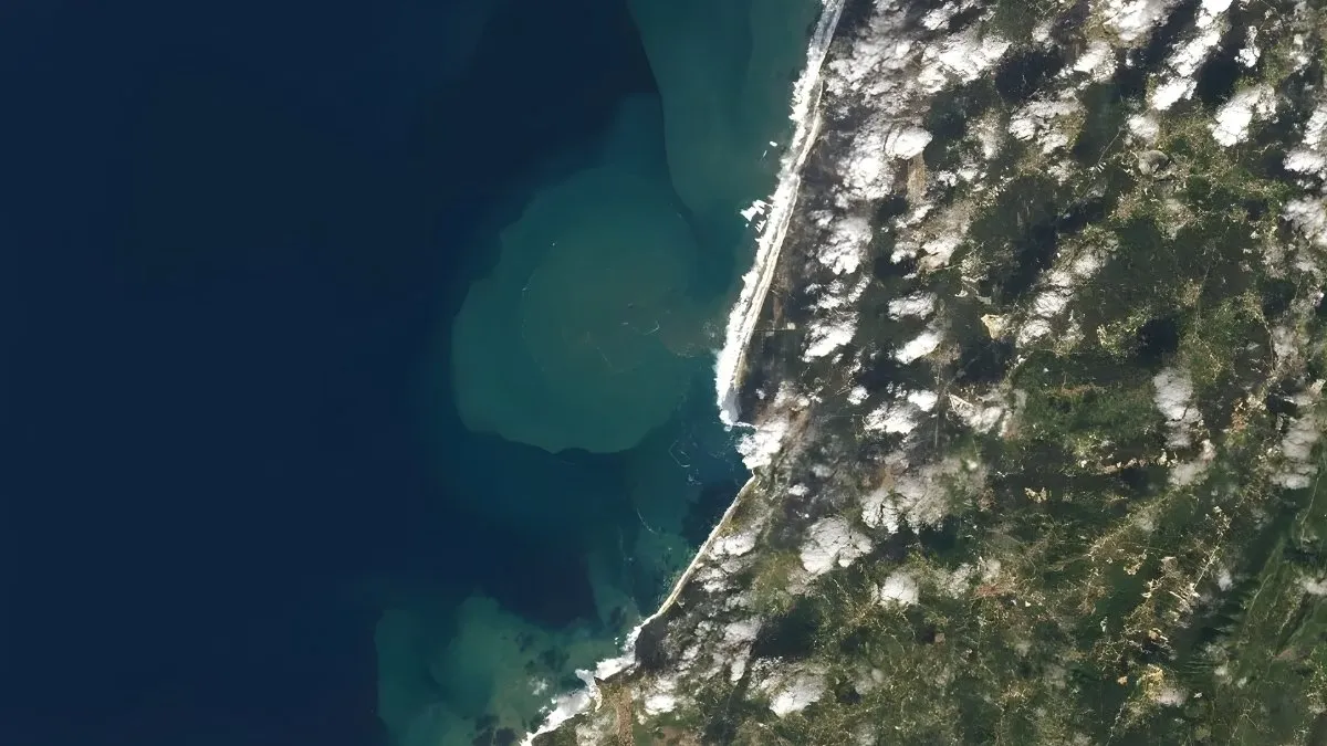 Na zdjęciu wykonanym przez satelitę obserwującego Ziemię widać wybrzeże w okolicach Nazaré, niewielkiego miasteczka na zachodzie Portugalii. Z góry linia brzegowa przypomina miejsce uderzenia gigantycznego pędzla: jasne smugi mętnej wody odrywają się od plaży i ciągną w głąb Atlantyku.