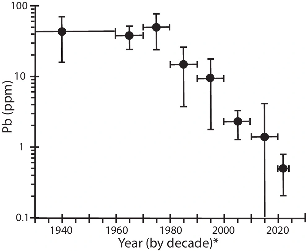 Wyniki są tak wyraziste, że trudno je nazwać przypadkowymi. W latach 60. i wczesnych 70. poziom ołowiu we włosach mieszkańców Utah sięgał nawet 100 ppm. W latach 90. spadł do około 10 ppm. A w 2024 r. średnia wynosiła już mniej niż 1 ppm.