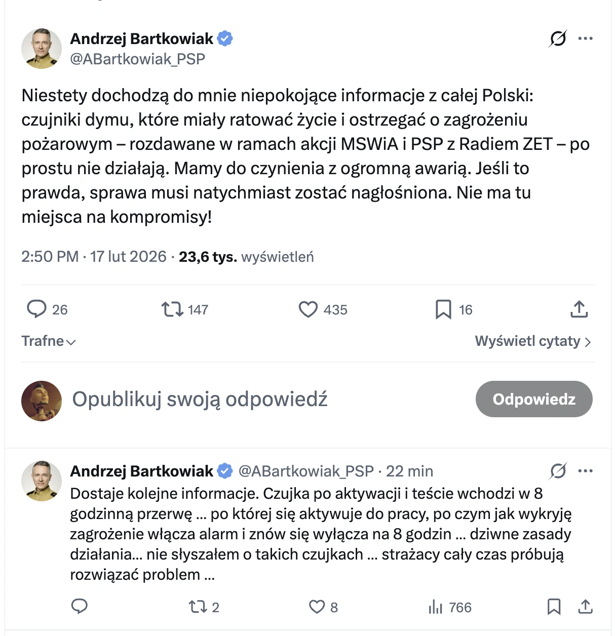 Według Andrzeja Bartkowiaka część czujników dymu działa nietypowo, co może sugerować ich awarię. Czujka po aktywacji i teście wchodzi w 8-godzinną przerwę, po której jest aktywna do pracy, ale jeżeli wykryje zagrożenie, to włącza alarm i znów się wyłącza na 8 godzin. To dosyć nietypowe działanie, ale na szczęście do wypowiedzi odniosła się Państwowa Straż Pożarna, która wskazuje na niewłaściwy sposób przeprowadzania testów.