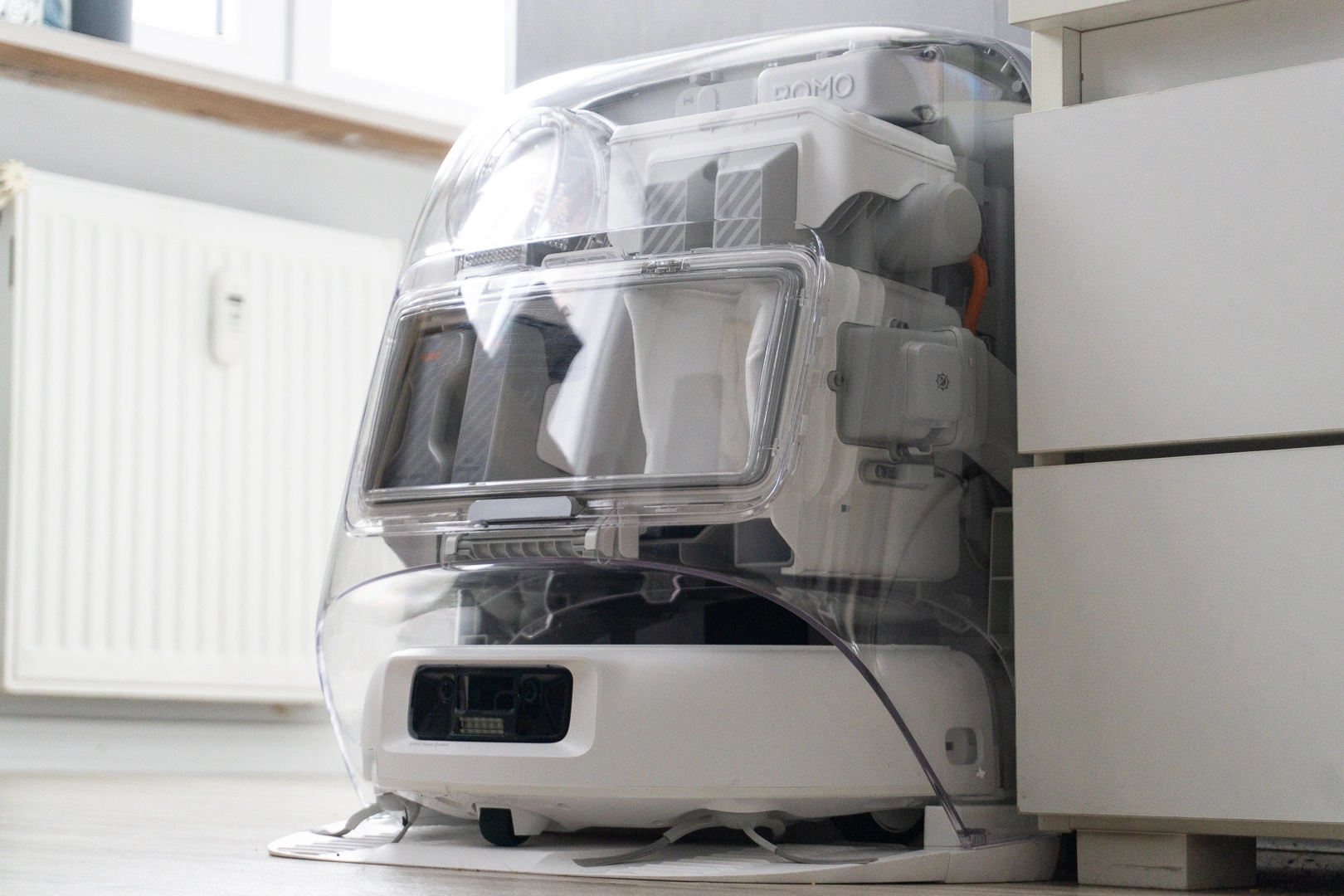 Teraz czas na rozczarowanie: mimo przezroczystej obudowy, wciąż nie jestem w stanie zobaczyć jak nieczystości pokonują drogę do worka w stacji albo jak brudna woda jest wysysana z komory. DJI zadbało o to, aby design – chociaż ekshibicjonistyczny – pozostawał elegancki. Dlatego użytkownik nie widzi nieczystości. Są tylko schludne przewody i osłony. Jedynie filtr w robocie z czasem się brudzi.