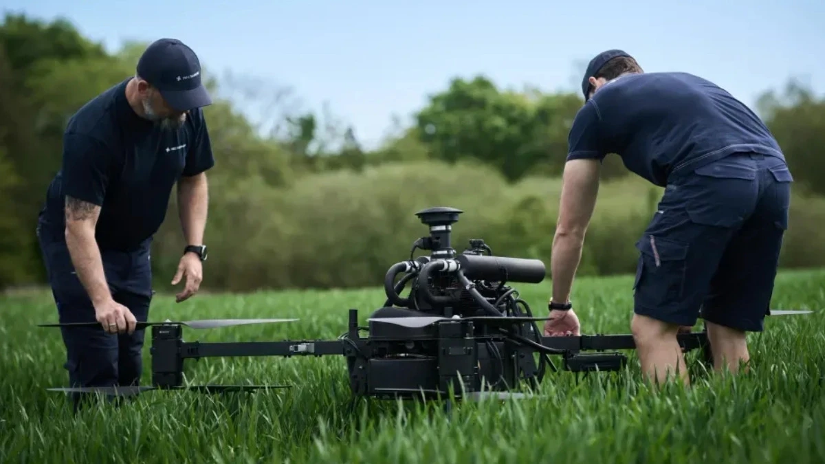 Konstrukcja powstała w Danii z myślą o zadaniach wymagających długiego czasu przebywania nad celem. HD-606 nie jest małym dronem jednorazowym. To pełnoprawna platforma, którą można wielokrotnie wysyłać na misję, wracać z nią do bazy, przezbrajać i tankować. Ważną rolę odgrywa tu napęd hybrydowy: 6 silników elektrycznych odpowiada za unoszenie i sterowanie, natomiast zabudowany silnik spalinowy z 32-litrowym zbiornikiem paliwa zasila pokładowy generator, który w locie produkuje energię elektryczną.