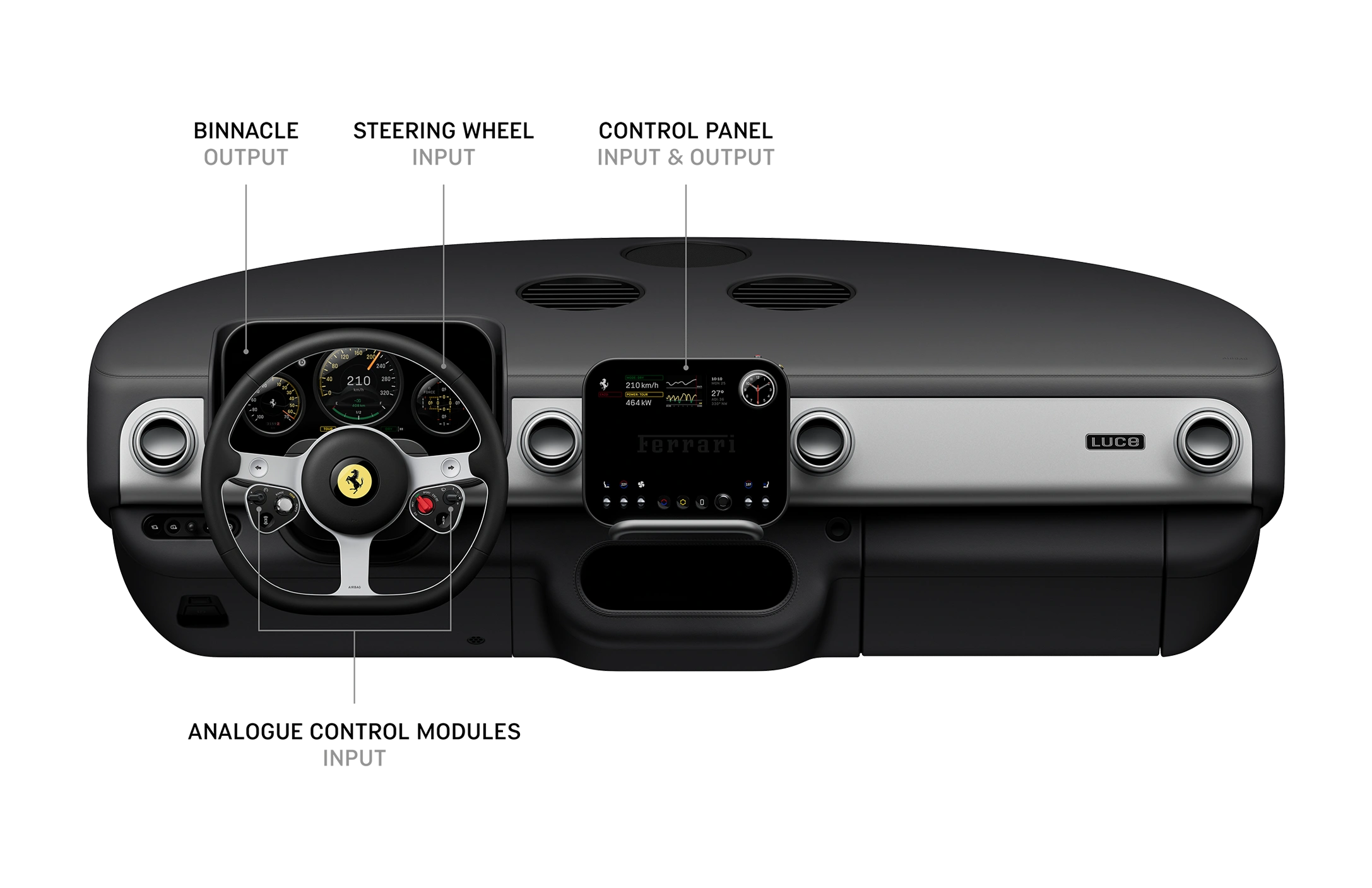 Centralny panel sterowania to ekran OLED o przekątnej 10,12 cala, zamontowany na przegubie kulowym, co pozwala na jego obracanie w stronę kierowcy lub pasażera. Pod ekranem znajduje się podparcie dłoni, a obsługa odbywa się za pomocą pięciu aluminiowych przełączników i szklanego pokrętła głośności. W prawym górnym rogu ekranu umieszczono multigraf - mechaniczno-cyfrowy zegar z trzema niezależnymi wskazówkami, który może pełnić funkcję zegara, chronografu, kompasu lub wskaźnika Launch Control. Mechanizm multigrafu to autorskie rozwiązanie LoveFrom.