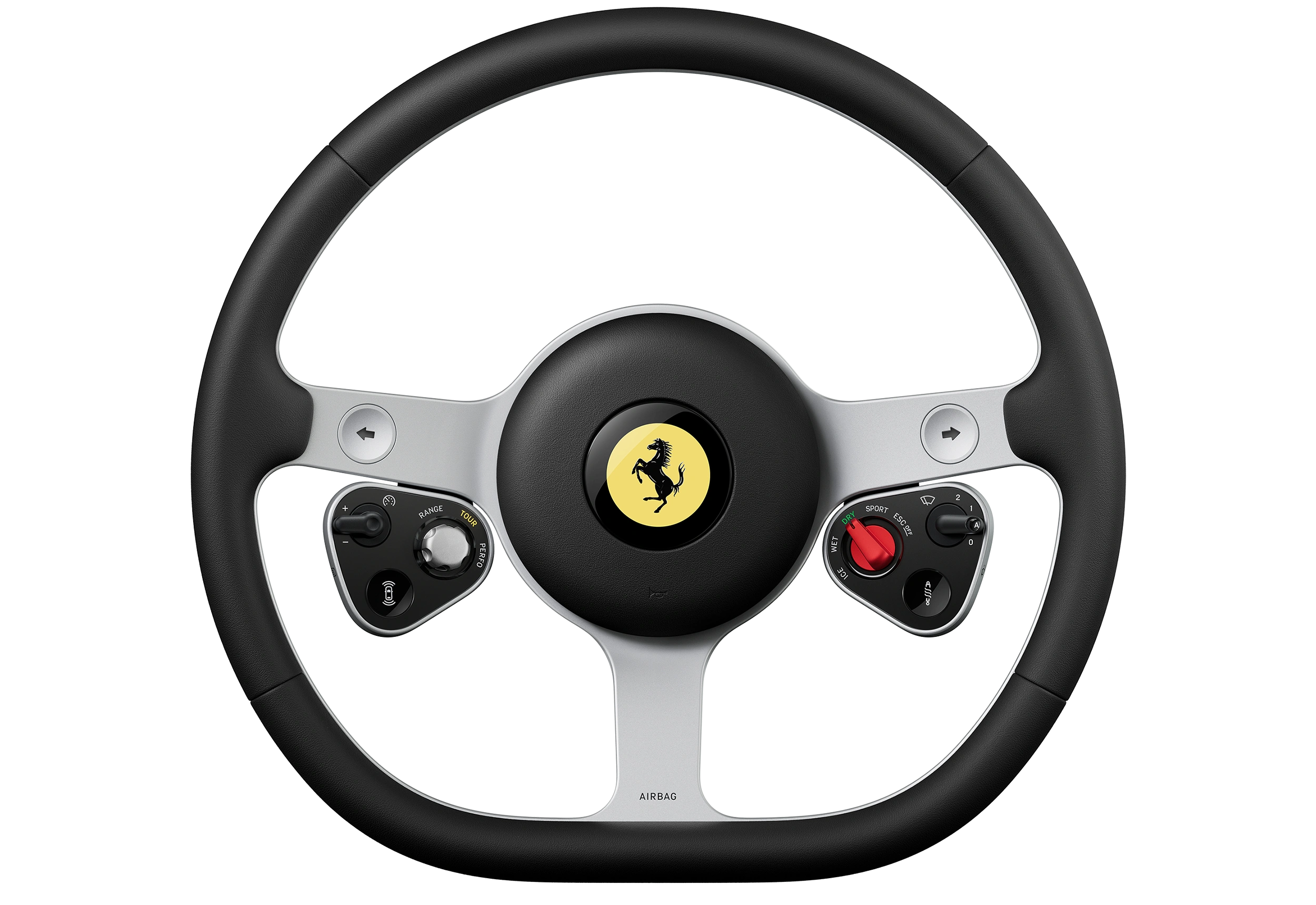 Kierownica Luce to reinterpretacja klasycznej, trójramiennej kierownicy Nardi wykonana z anodowanego aluminium i skóry. Składa się z 19 elementów obrabianych CNC, jest o 400 gramów lżejsza od standardowej, a jej struktura została celowo odsłonięta, by podkreślić wytrzymałość i jakość materiału. Na ramionach umieszczono dwa analogowe moduły sterowania - po prawej manettino do wyboru trybów jazdy (Range, Tour, Performance), po lewej manettino do konfiguracji podwozia i zawieszenia.
