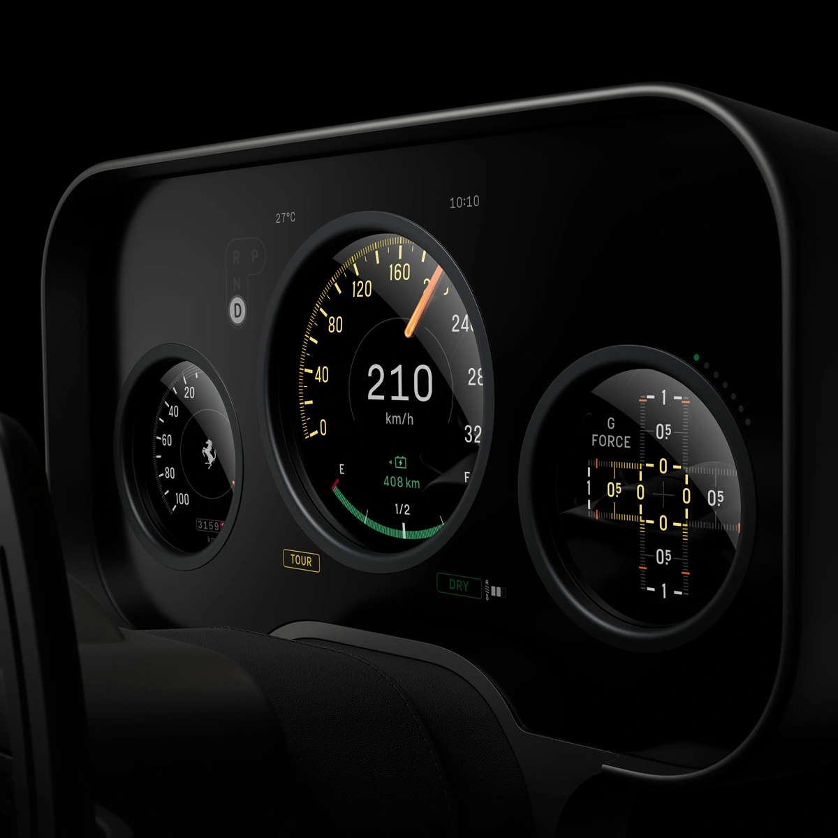 Typografia wskaźników została zaprojektowana specjalnie dla Luce (LoveFrom Maranello), inspirowana historycznymi zegarami Veglia i Jaeger z lat 50. i 60. Kolory podświetlenia zmieniają się w zależności od trybu jazdy (zielony - Dry, bursztynowy - Sport, niebieski - Wet, jasnoniebieski - Ice, czerwony - ESC Off).
