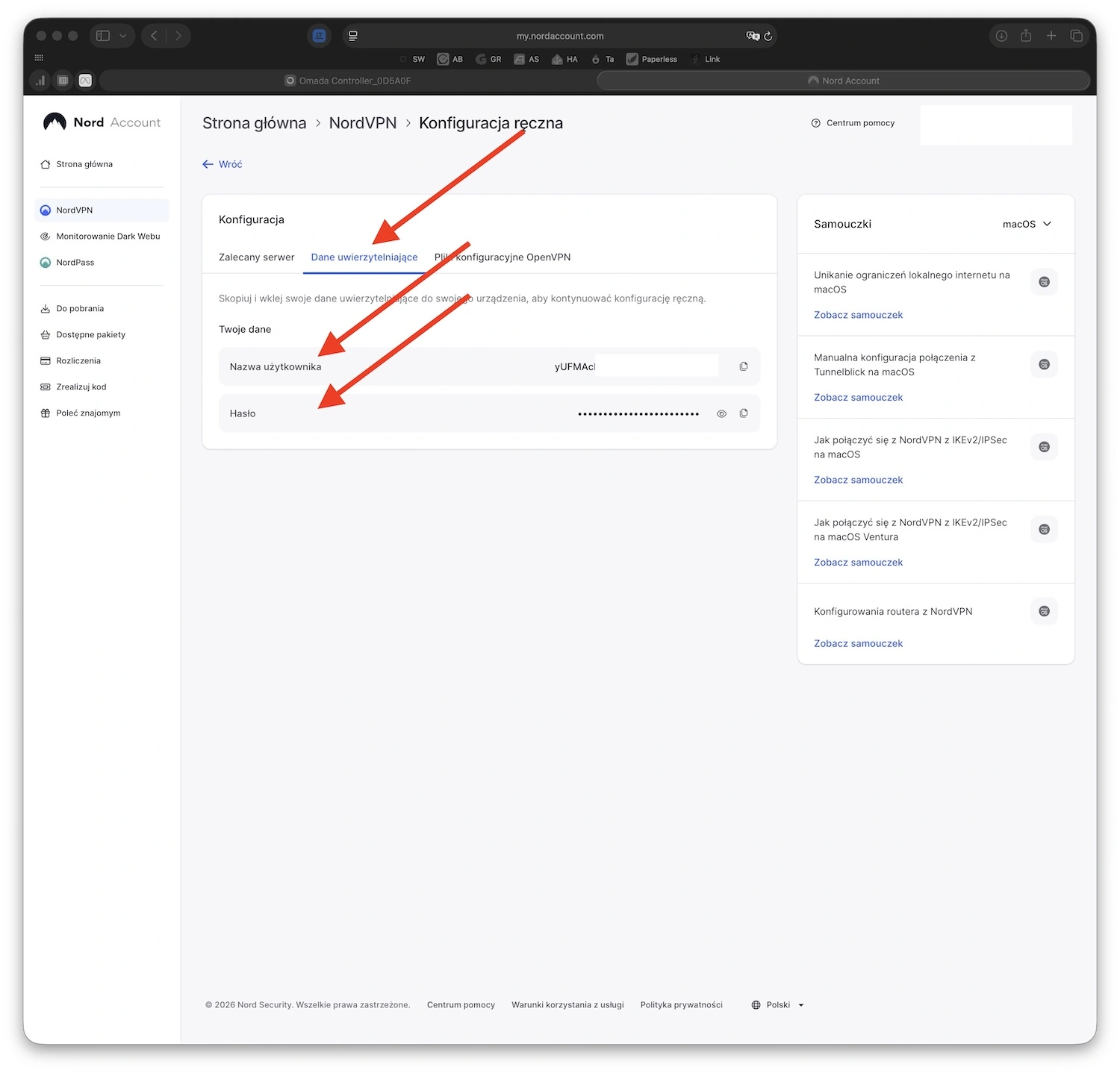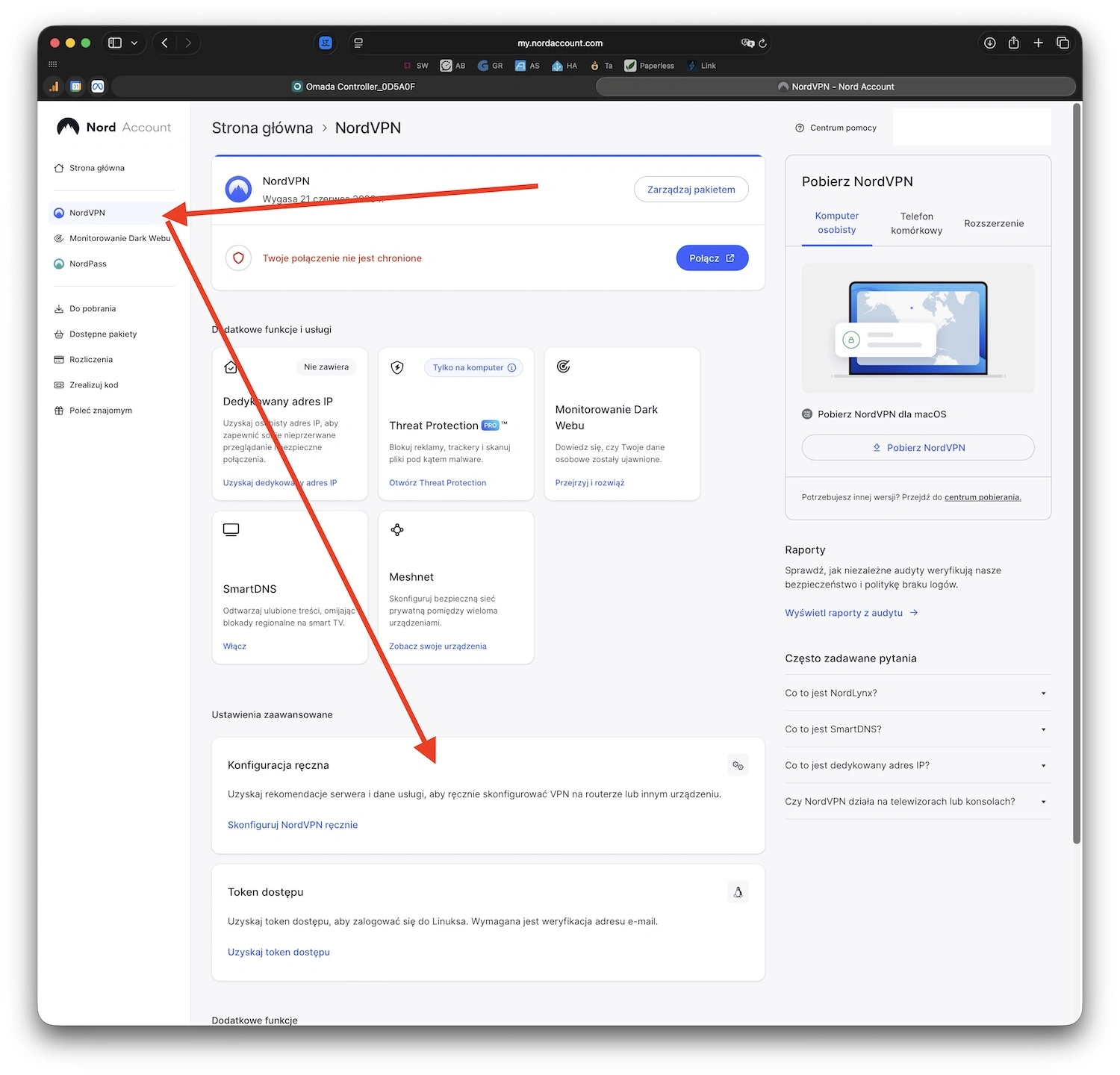 W tym momencie zostawiamy na chwilę Omadę i logujemy się do naszego konta NordVPN. Z lewego panelu wybieramy "NordVPN" i "Konfiguracja ręczna". Klikamy w "Skonfiguruj NordVPN ręcznie" i przechodzimy dalej.