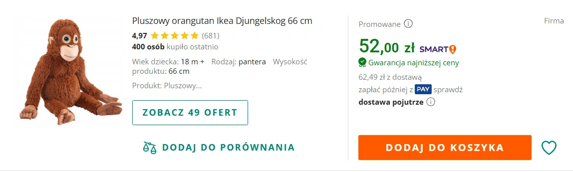 Jeżeli jednak ktoś ze Stanów Zjednoczonych nie chce tyle czekać, to jego druga najlepsza opcja to eBay, gdzie Ikea Djungelskog można kupić za 99 dol. (ok. 355 zł), czyli pięć razy drożej niż w Ikei. Jednak cena pluszaka zmienia się dynamicznie i na eBayu można znaleźć Oran-mamy, za które sprzedający życzy sobie ponad 300 dol.