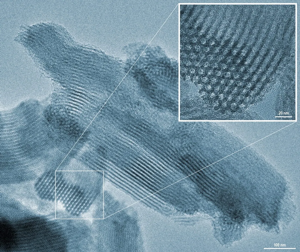 B-STING (Biocidal Silica-Templated Immobilized Nano-Groups) to nanokompozyt o niezwykłej architekturze. Jego podstawą jest krzemionka przypominająca strukturę plastra miodu, pełna cylindrycznych mezoporów o średnicy zaledwie ośmiu nanometrów.
