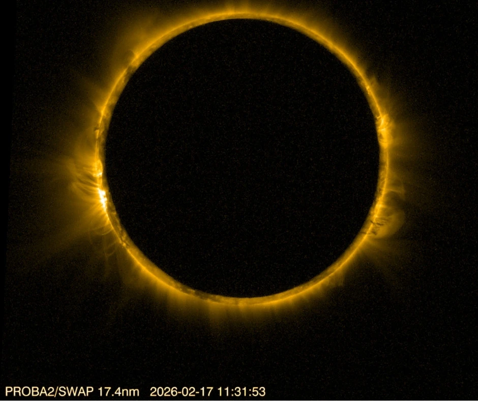 Co istotne, Proba-2 nie fotografuje gwiazdy w takim świetle, w jakim widzimy ją gołym okiem. Obraz powstaje dzięki kamerze SWAP, rejestrującej promieniowanie w ekstremalnym ultrafiolecie o długości fali 17,4 nanometra. To zakres, w którym doskonale widać gorącą, zjonizowaną plazmę korony słonecznej, czyli najbardziej zewnętrznej warstwy atmosfery naszej gwiazdy. Na zdjęciach z SWAP pierścień ognia to tak naprawdę świecąca korona, otaczająca zakryty przez Księżyc, ciemny środek tarczy Słońca.