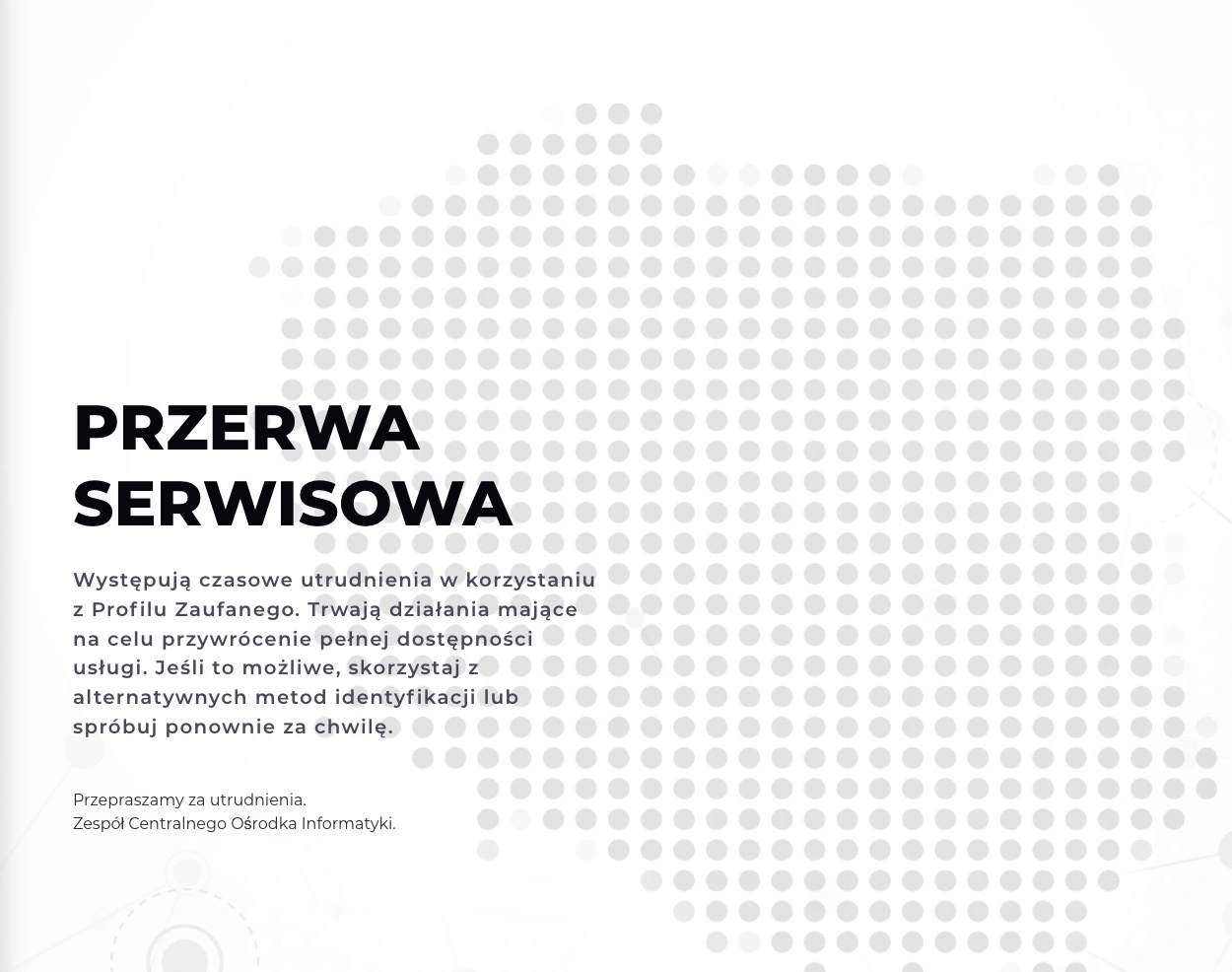Zgłoszenia wynikają z faktu braku możliwości skorzystania z Profilu Zaufanego. Jeśli wcześniej chcieliśmy skorzystać z narzędzia widzieliśmy błąd "ta witryna jest nieosiągalna". Centralny Ośrodek Informatyki obsługujący rządowe usługi logowania zauważył problem i teraz wyświetla się komunikat "Przerwa serwisowa". Na witrynie otrzymujemy krótki komunikat.