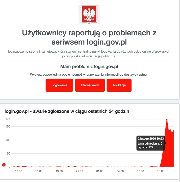 W serwisie Downdetector widać setki zgłoszeń dotyczących rządowych serwisów. Polacy narzekają na działanie usług takich jak: login.gov.pl, Podatki, mObywatel oraz ZUS. W zależności od serwisu liczba zgłoszeń waha się między kilkadziesiąt aż do niemal 200.