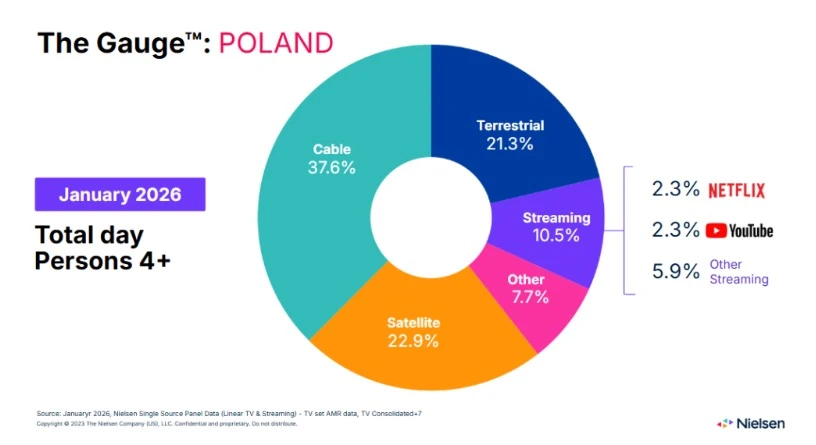 Na drugim miejscu znalazł się streaming z wynikiem 10,5 proc., gdzie najpopularniejsze są dwie marki: Netflix oraz YouTube z 2,3-procentowym udziałem. Wynik YouTube’a w porównaniu z grudniem 2025 r. spadł z 2,6 proc., natomiast popularność Netflixa wzrosła z 2,1 proc. Pozostałe platformy VOD stanowią 5,9 proc. oglądalności.