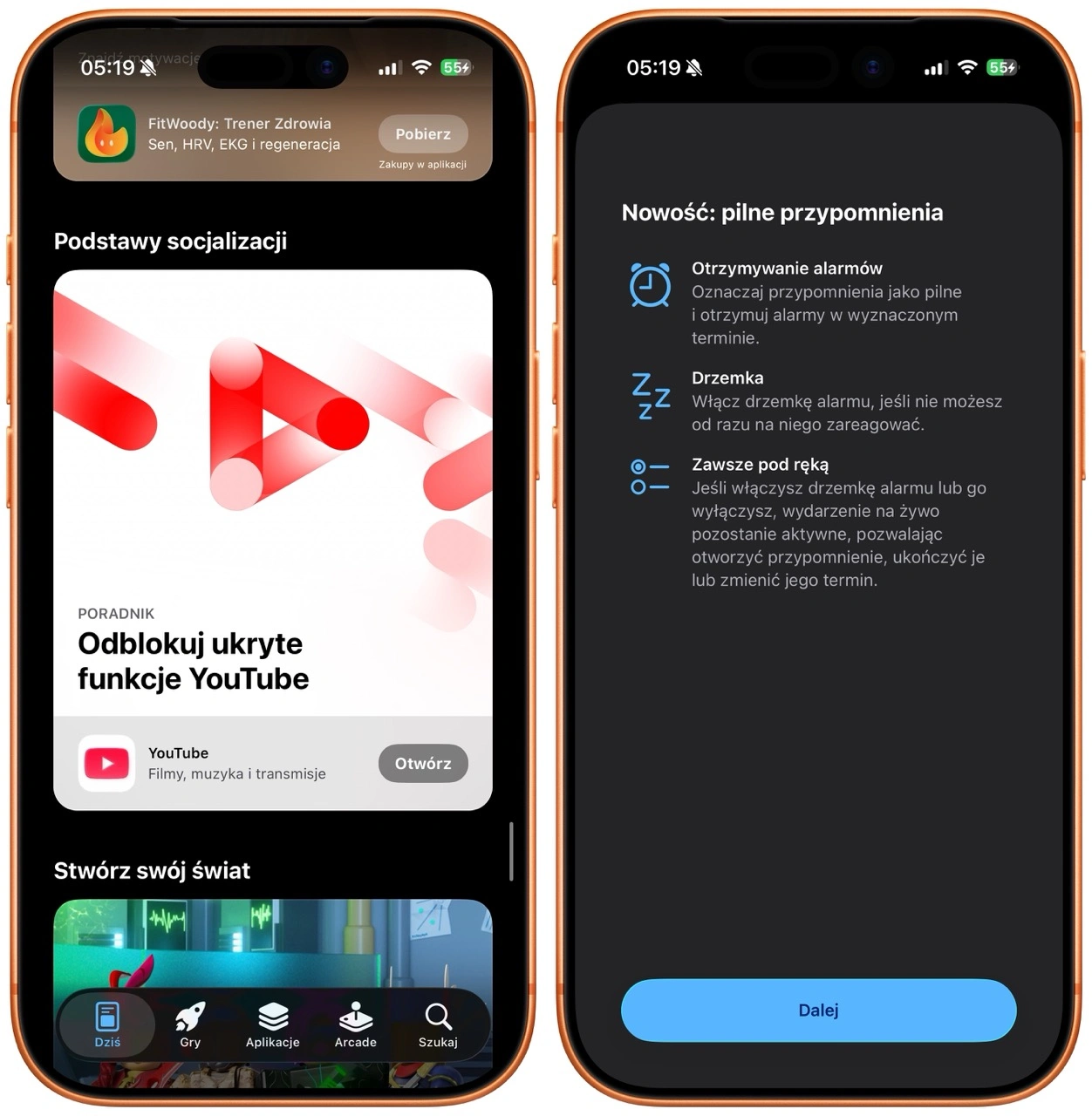 Usprawnienia trafiły także do narzędzi produktywnych. W Przypomnieniach pojawiła się sekcja „Pilne”. Zadania oznaczone w ten sposób automatycznie uruchomią alarm w momencie terminu wykonania, co ma zapobiec ich przegapieniu. Z kolei w aplikacji Skróty dodano nowe akcje, pozwalające między innymi na ustawianie limitu ładowania baterii oraz zarządzanie lokalizacjami w aplikacji Pogoda.