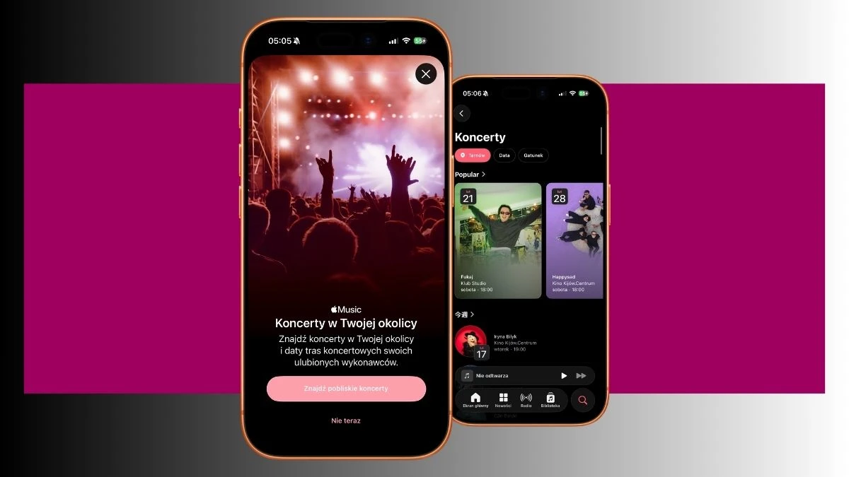 Dodatkowo odświeżono wygląd albumów i playlist, wprowadzając pełnoekranowe okładki, a nowa funkcja Koncerty w Twojej okolicy pomaga znaleźć występy ulubionych artystów... w najbliższej okolicy.