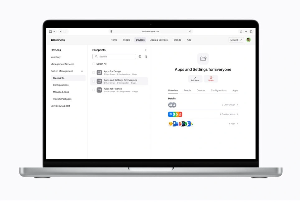 Apple Business zawiera gotowe szablony, które umożliwiają konfigurowanie Maków i iPhone'ów za pomocą wstępnie ustawionych parametrów czy aplikacji. Oznacza to w praktyce, że urządzenia przypisane do organizacji po wyciągnięciu z pudełka będą gotowe do użycia za sprawą zainstalowanego oprogramowania. Administratorzy oczywiście też są w stanie skonfigurować urządzenia w taki sposób, aby np. nie były wykorzystywane w innych celach niż służbowych.
