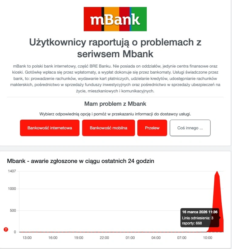 Awaria rozpoczęła się poniedziałkowe przedpołudnie ok. godz. 10:30 i dotknęła tysięcy użytkowników mBanku. Bank wie o całej sytuacji i już potwierdził możliwość występowania trudności z usługami.