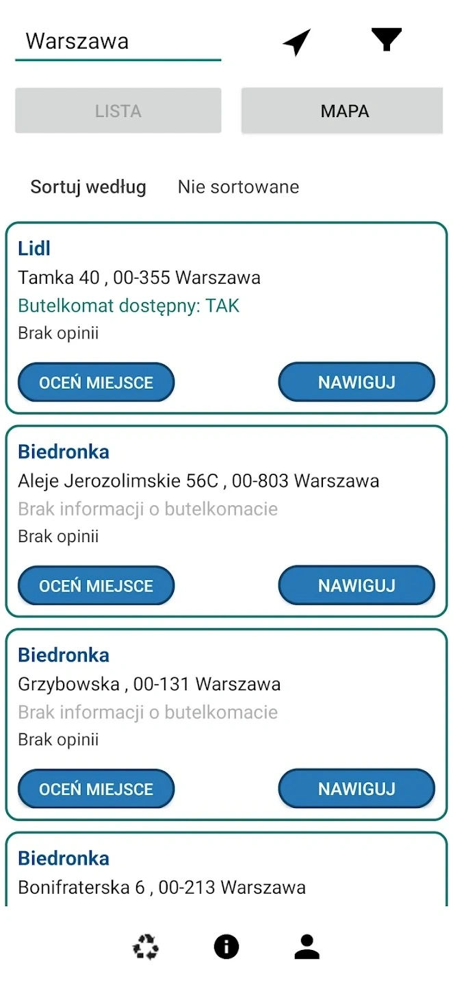Ta prosta aplikacja to w rzeczywistości interaktywna mapa butelkomatów oraz punktów zwrotu butelek w całej Polsce. W bazie danych znajduje się już ponad 20 tys. sklepów oraz przeszło 10 400 zweryfikowanych punktów odbioru. Rozwiązanie ma kilka kluczowych zalet. Najważniejszym z nich jest lokalizowanie najbliższego automatu - po kliknięciu ikony urządzenia możemy od razu uruchomić nawigację do celu.