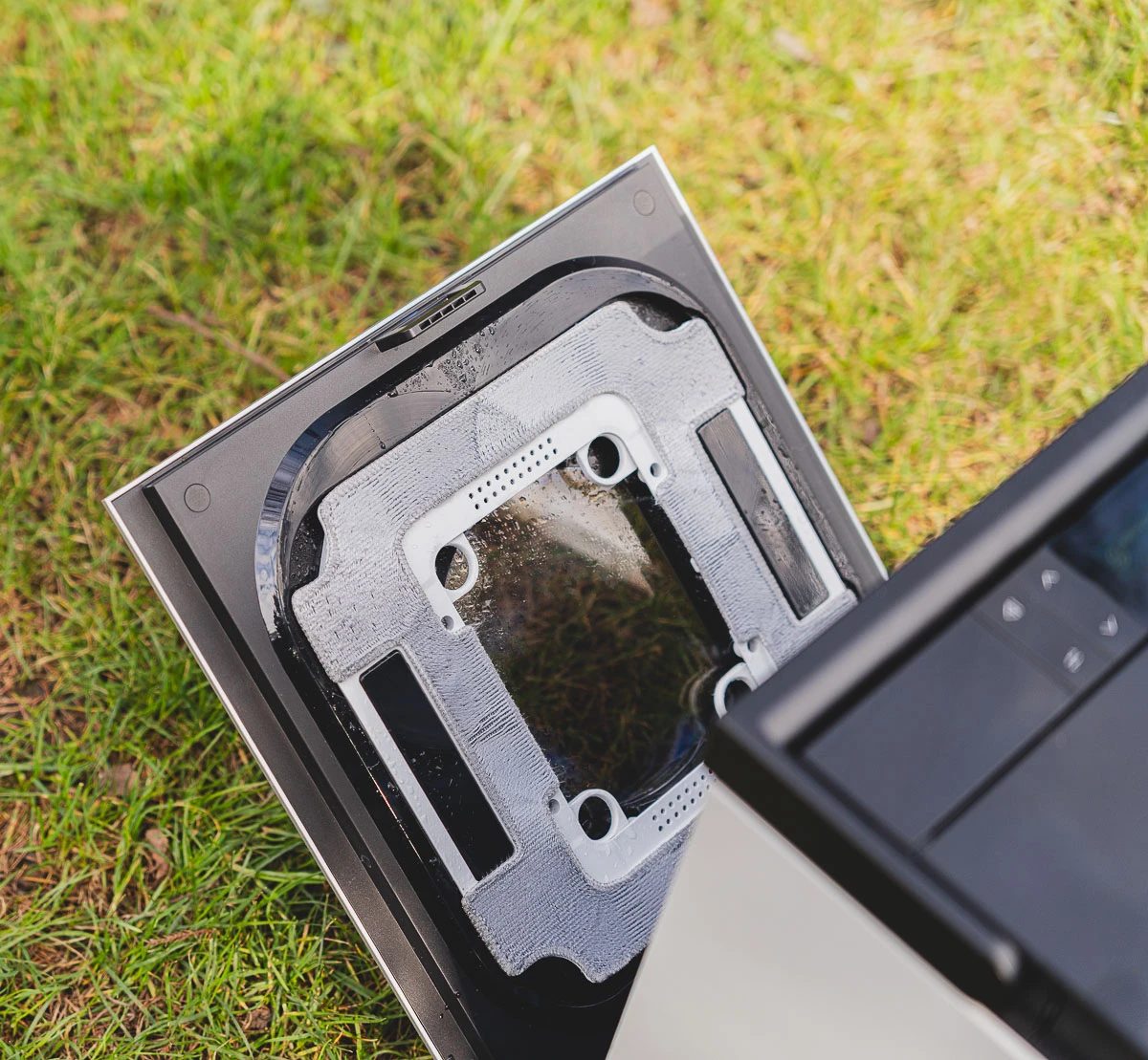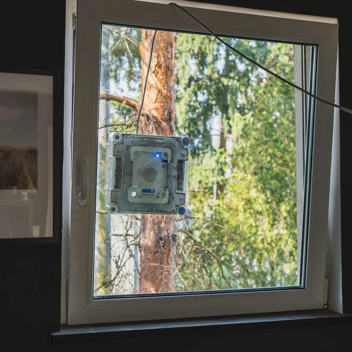 Nie pozostało mi nic innego, niż zatargać na piętro bazę z robotem i pojemnikami z wodą (sumarycznie - około 14 kg), włączyć bazę, przytrzymać przycisk na robocie i po prostu przykleić go do szyby.