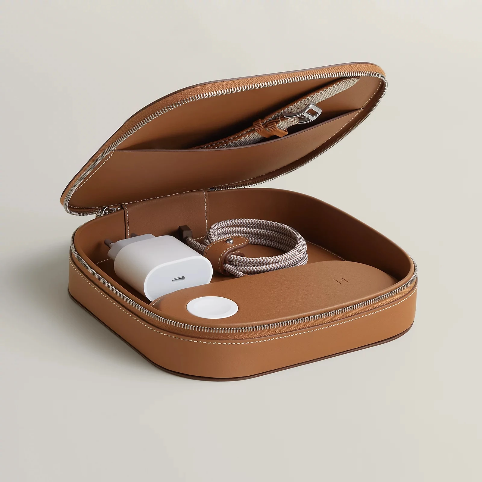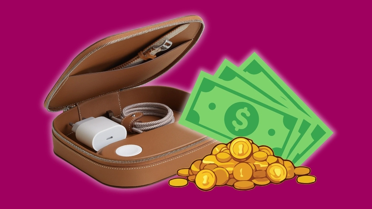 Hermès oferuje zestaw składający się z ładowarki Paddock Duo i skórzanego etui Grand Paddock wykonanego z cielęcej skóry Swift w kolorze Gold. Sama ładowarka ma dwie strefy MagSafe i według opisu producenta pozwala jednocześnie ładować dwa urządzenia: iPhone’a oraz AirPodsy albo Apple Watcha. Produkt jest wykonany we Francji i pozycjonowany jako akcesorium podróżne premium. Brzmi pięknie, prawda?