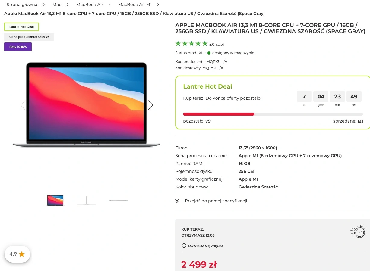 Sklep Lantre uruchomił promocję na MacBooka Air M1. Ten dawno temu wycofany ze sprzedaży sprzęt jest dostępny w cenie 2499 zł. Oferta dotyczy wersji z 16 GB RAM i 256 GB pamięci na dysku SSD.