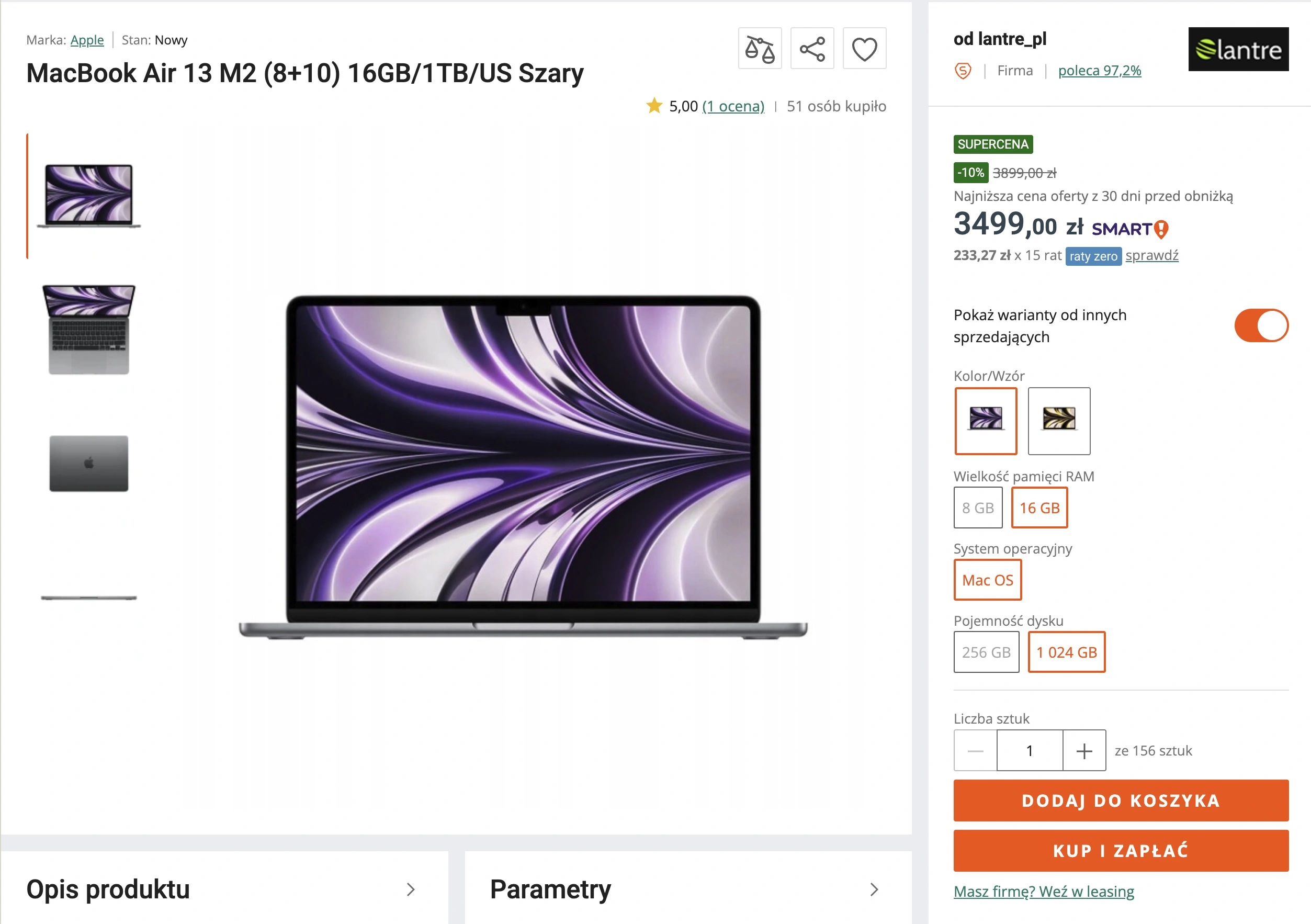 Mowa o MacBooku Air z procesorem M2. Sprzęt można kupić za niespełna 3,5 tys. zł na Allegro, gdzie sprzedawcą jest znany sklep Lantre. Konkretna wersja wyróżnia się mnóstwem pamięci operacyjnej. Kupimy go aż 2000 zł taniej w porównaniu z najnowszym MacBookiem Air wyposażonym w układ Apple M5.