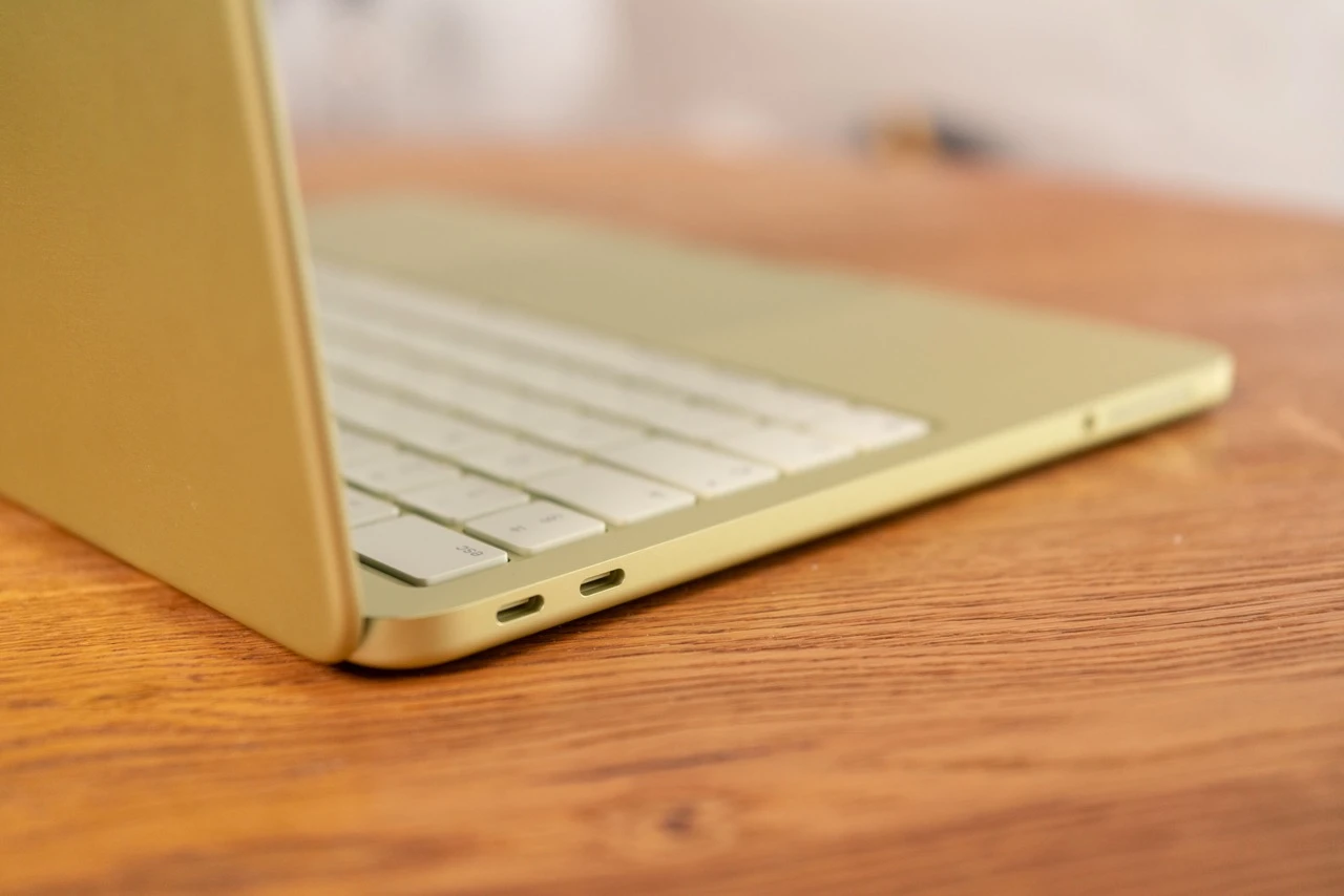 Jeśli z kolei chodzi o porty, to nie mamy tutaj MagSafe’a, ale w obudowie znajdziemy minijacka i dwa złącza USB-C. Jedno z nich, to bliżej klapy, działa w standardzie USB 3, podczas gdy to drugie - w standardzie USB 2. Dobra wiadomość jest przy tym taka, że jeśli podepniemy akcesorium, takie jak np. dysk przenośny do wolniejszego portu, to macOS nas poinformuje, że drugi port byłby szybszy.