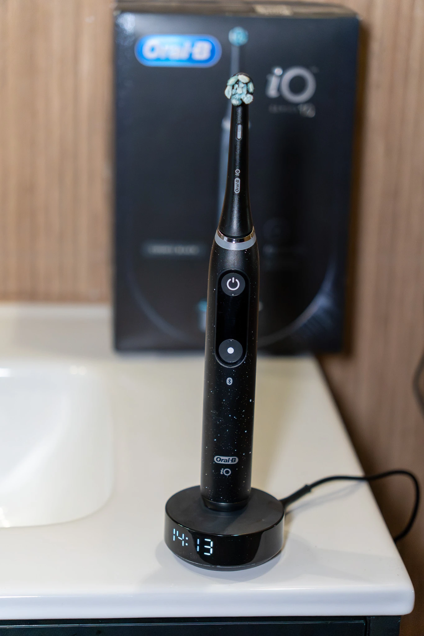 Zaawansowane modele, takie jak Oral-B iO10, oferują dodatkowo inteligentną ładowarkę iO Sense, która na co dzień służy jako stabilna podstawa. Baza ta nie tylko uzupełnia energię w akumulatorze, ale na bieżąco przekazuje spersonalizowane wskazówki, podpowiadając w jaki sposób i gdzie dokładnie należy szczotkować zęby. Na jej froncie znajduje się czytelny zegar odliczający czas mycia. To wygodne rozwiązanie, dzięki któremu wszystkie najważniejsze dane są widoczne bez potrzeby sięgania po smartfona.