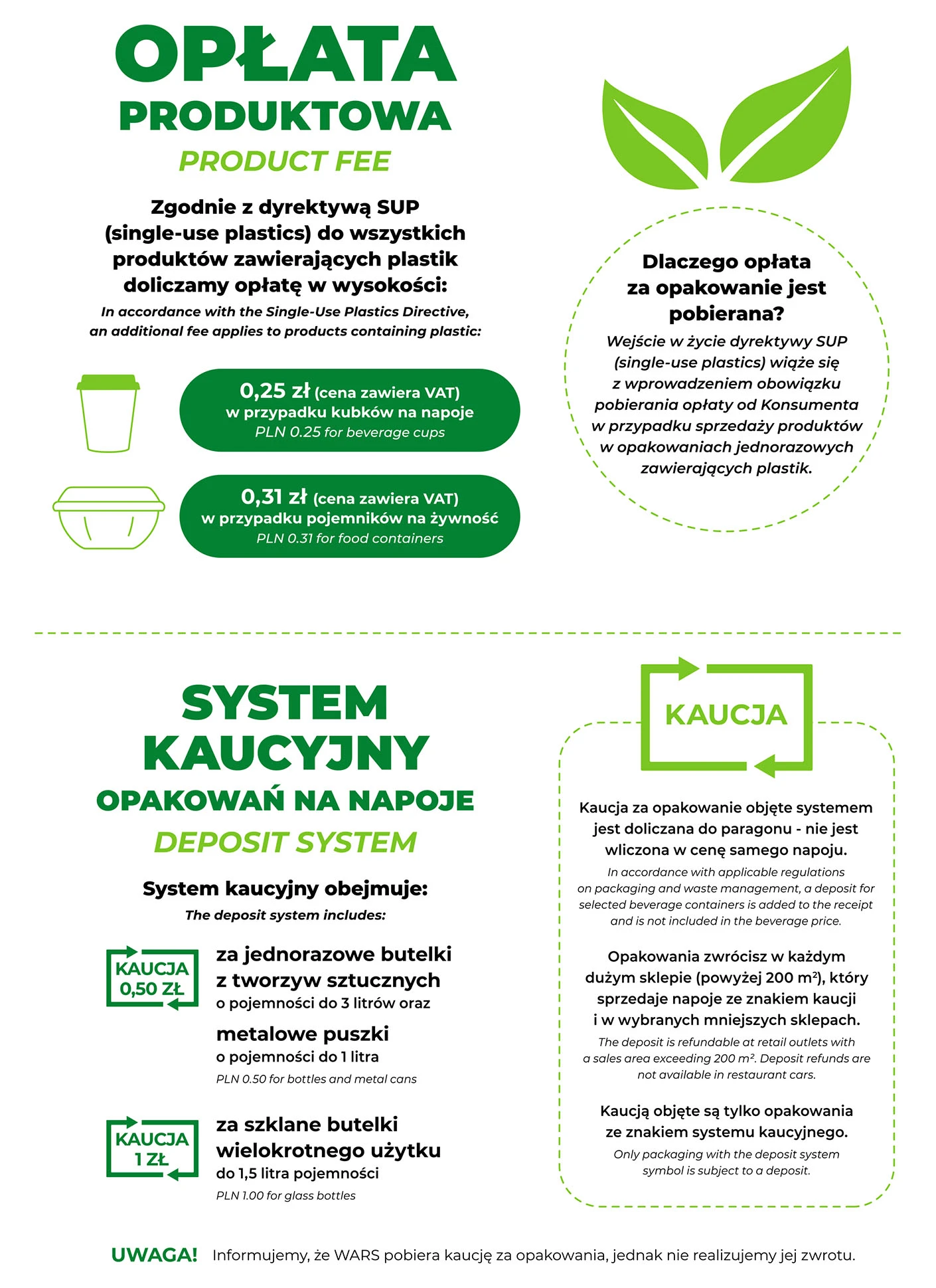 Kluczowa informacja znajduje się jednak na samym dole komunikatu. WARS wprost informuje, że pobiera kaucję za opakowania, ale nie prowadzi ich zwrotu w wagonie restauracyjnym.