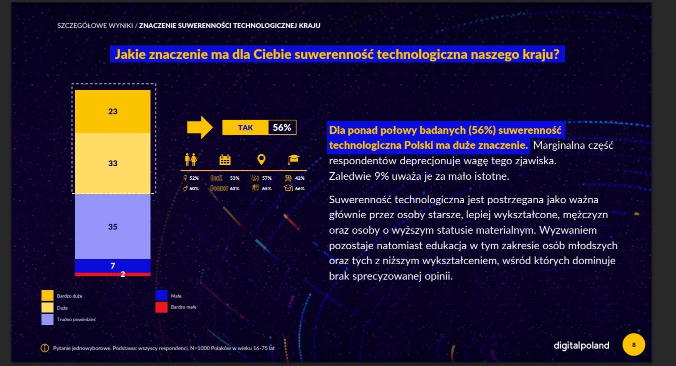 Dotarłem do raportu Suwerenność technologiczna Polski i Europy przygotowanego przez Digital Poland. Według niego dla ponad połowy badanych (56 proc.) suwerenność technologiczna Polski ma duże znaczenie. Suwerenność technologiczna jest postrzegana jako ważna głównie przez osoby starsze, lepiej wykształcone, mężczyzn oraz osoby o wyższym statusie materialnym. Wyzwaniem pozostaje natomiast edukacja w tym zakresie osób młodszych oraz tych z niższym wykształceniem, wśród których dominuje brak sprecyzowanej opinii.