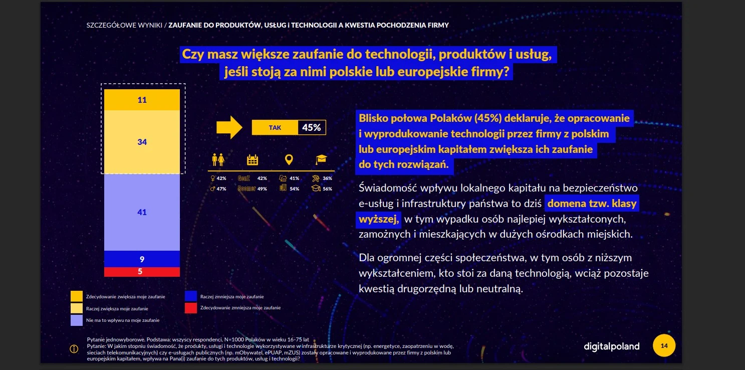 Jednocześnie Aż 42 proc. badanych nie potrafi ocenić czy Polska jest przygotowana do suwerenności technologicznej i zapewne to najbardziej szczera odpowiedź. Nie jestem jednak przekonany czy wszyscy ankietowani (1000 osób w wieku 16-75 lat) byli w stanie przyznać się, że nie do końca rozumieją to pojęcie. Powiem więcej, sam musiałem się chwilę zastanowić, o co chodzi autorom. Wzrusza mnie lekko ukryty klasizm płynący z tego badania - jak jesteś dobrze zarabiającym mężczyzną z wyższym wykształceniem i wyższym standardem życia, to wiesz, że suwerenność jest bardzo ważna, a jak masz wykształcenie zasadnicze, niższy standard życia i słabą sytuację finansową, to nie dostrzegasz tego problemu. Nie będę mówił o tym mojemu fachowcowi od wykończeń, bo z oburzenia jeszcze sprzeda jedno z mieszkań.
