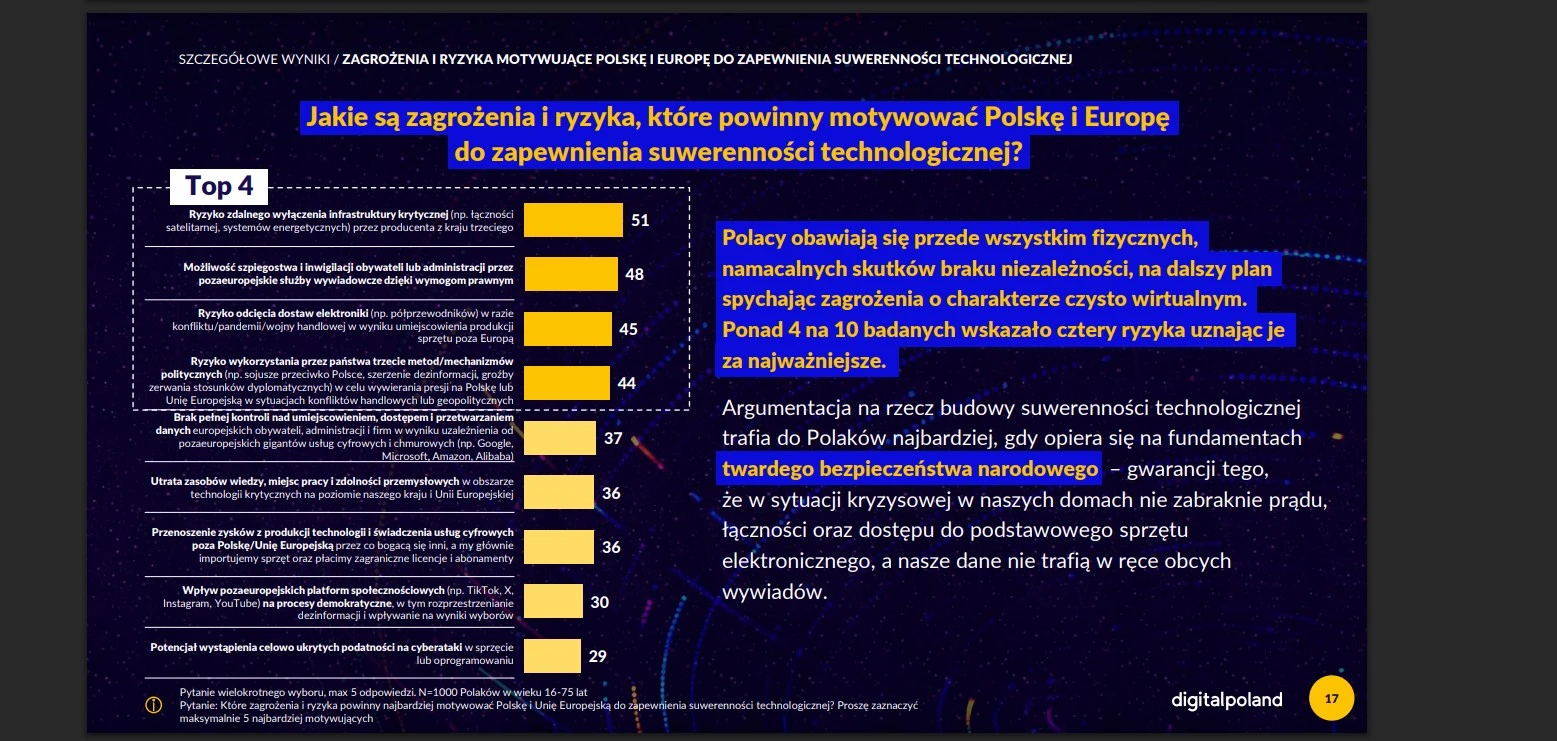 Możemy mieć cyfrową suwerenność, ale najpierw musimy mieć zapewnione najważniejsze potrzeby, a dopiero później pomyślimy o ideach i o tym, żeby zapłacić więcej za polską usługę/towar. Kolejne raporty nic nie zmienią, bo równie dobrze możemy pytać, czy chcemy mieć tańsze mieszkania. Oczywiście, że chcemy, tylko co z tego? Od takich pytań nic się nie zmienia.