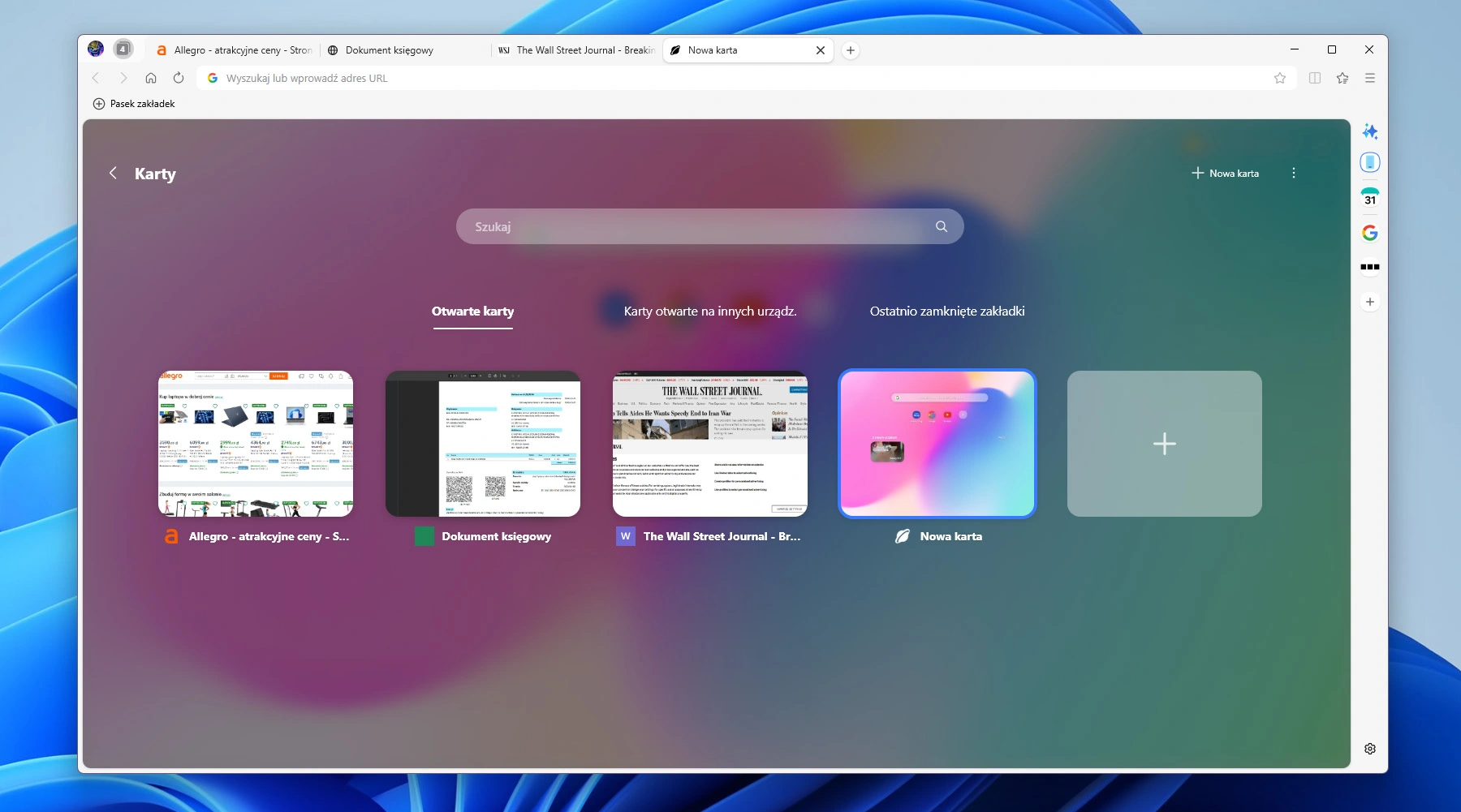 Również odmiennie od Chrome, w Samsung Browser obecny jest pasek boczny, z którego użytkownik ma łatwy dostęp do asystenta AI (wymagającego dodatkowej instalacji i obecnie ograniczonego regionalnie) oraz do zsynchronizowanych urządzeń - w moim przypadku jedynie Galaxy S25. W założeniu, że nie ma się ani tego ani tego, pasek boczny w przeglądarce Samsunga może służyć jako trzeci pasek zakładek lub jako panel boczny do otwarcia drugiej strony internetowej. Albo można go odpiąć i zyskać trochę miejsca.