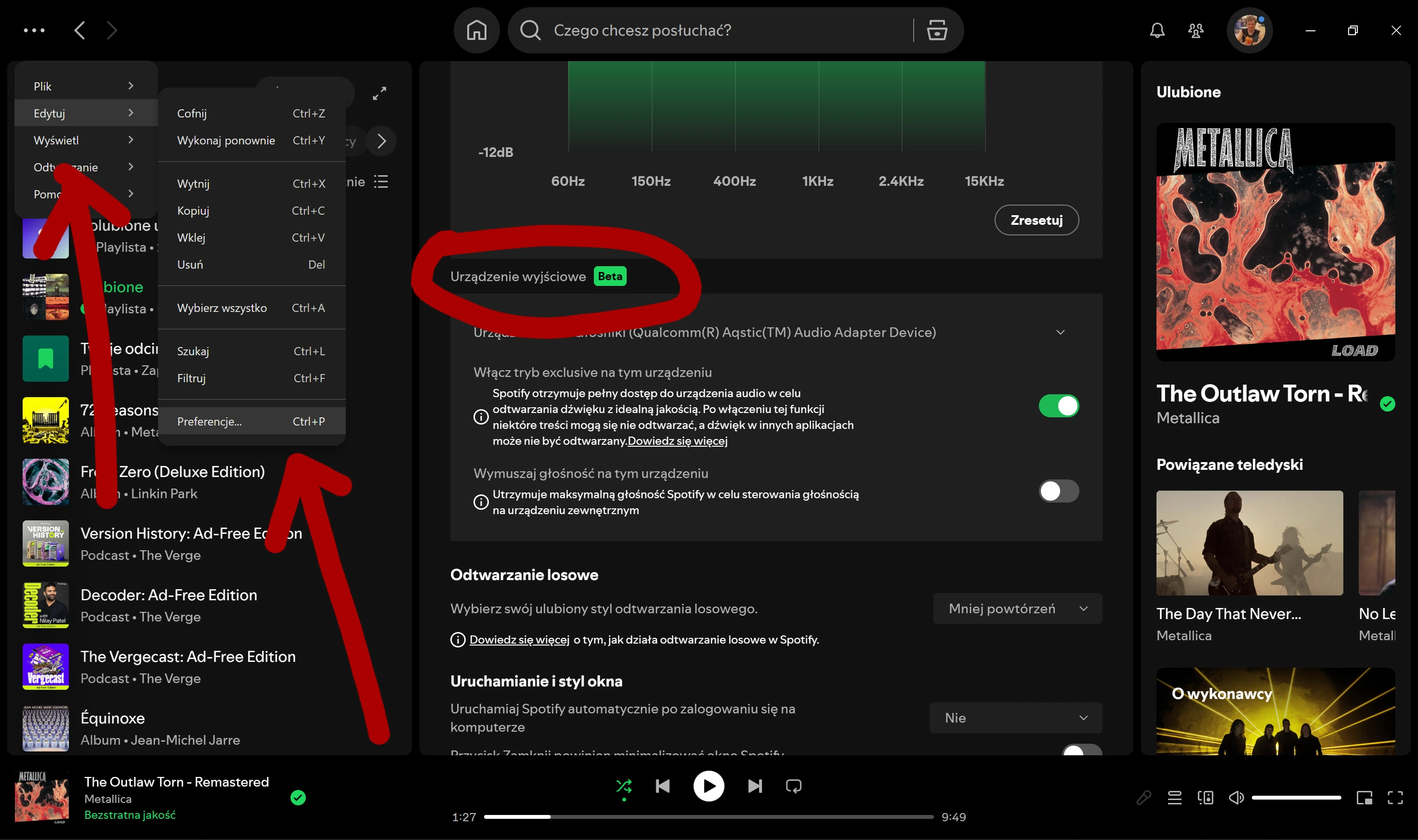 Exclusive Mode jest dostępny w aplikacji Spotify na Windowsie, w sekcji ustawień odtwarzania. Wystarczy wejść w ustawienia, przewinąć do zakładki Odtwarzanie, wybrać w „Urządzenie wyjściowe” konkretne urządzenie (np. zewnętrzny DAC, interfejs USB, wyjście słuchawkowe laptopa), a następnie przełączyć przełącznik Exclusive Mode na „On”.
